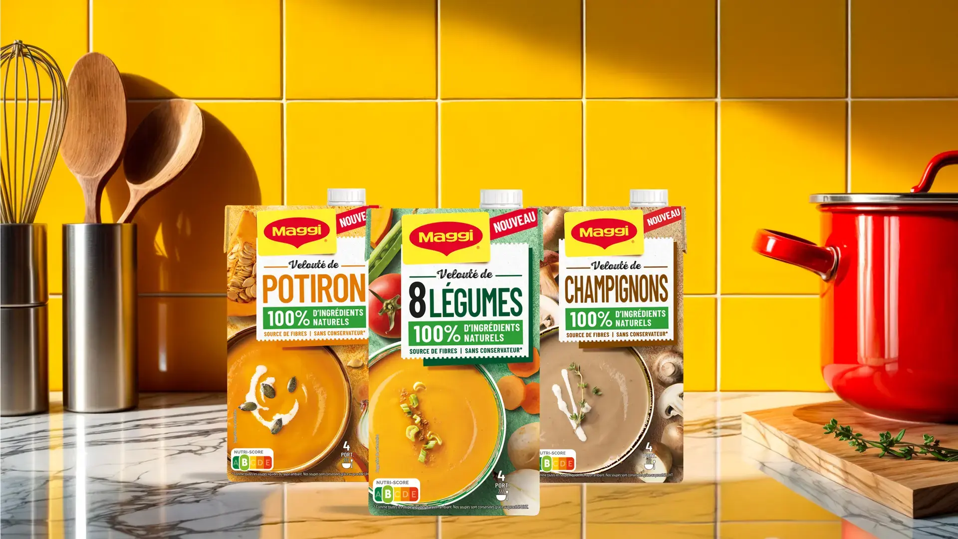 La soupe n’est plus réservée seulement aux soirées d’hiver sous un plaid… Et oui, MAGGI® débarque avec sa toute première gamme de soupes liquides 100 % Nutri‑Score B, à base d’ingrédients 100% d’origine naturelle.