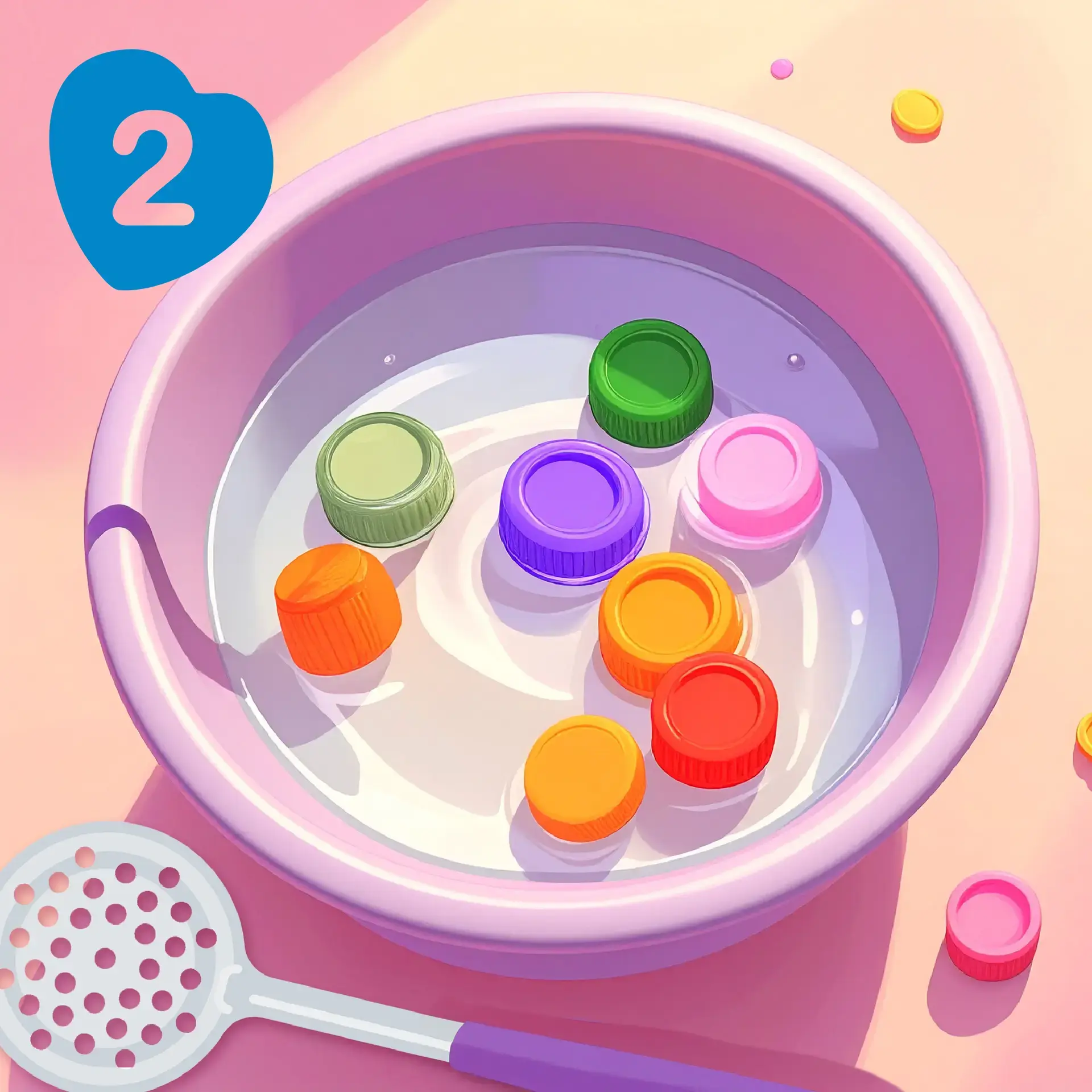 Aidez bébé à pêcher les bouchons et à les transvaser dans le second saladier**.