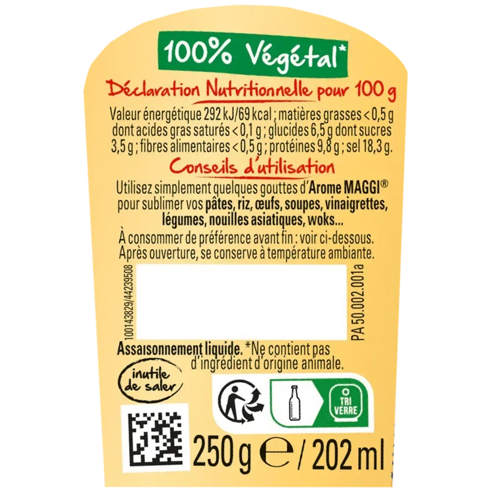 Un concentré de saveurs 100% végétal. L'Arome MAGGI est un assaisonnement comme le sel et le poivre. L'Arome agrémentera d'une saveur unique tous vos plats, chauds et froids, en toute légèreté.