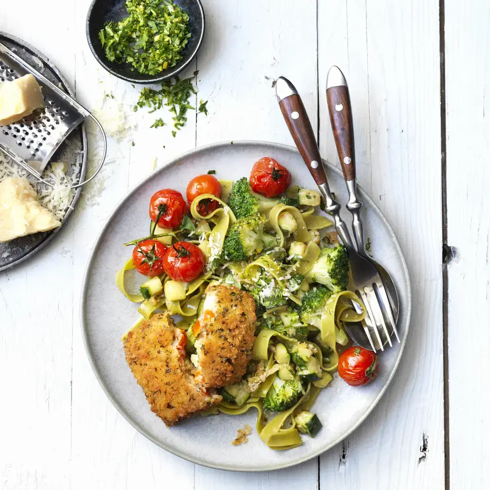 Ingrédients : tomates 29,1 %, FROMAGE blanc végétarien au LAIT écrémé pasteurisé 14%, chapelure 11,3% (farine de BLÉ, levure, sel, huile de colza, épices (paprika, curcuma), extrait de paprika), MOZZARELLA végétarienne (LAIT) 7%, huiles végétales (colza, tournesol) en proportion variable, oignons, plantes aromatiques (basilic, persil, thym), amidon de maïs, blanc d'ŒUF en poudre 3,9%, EDAM végétarien (LAIT) 3,5%, farine de BLÉ, ail, correcteur d'acidité : vinaigre tamponné ; fibres de bambou, sucre, sel. Peut contenir : SOJA, SÉSAME, CÉLERI et MOUTARDE.