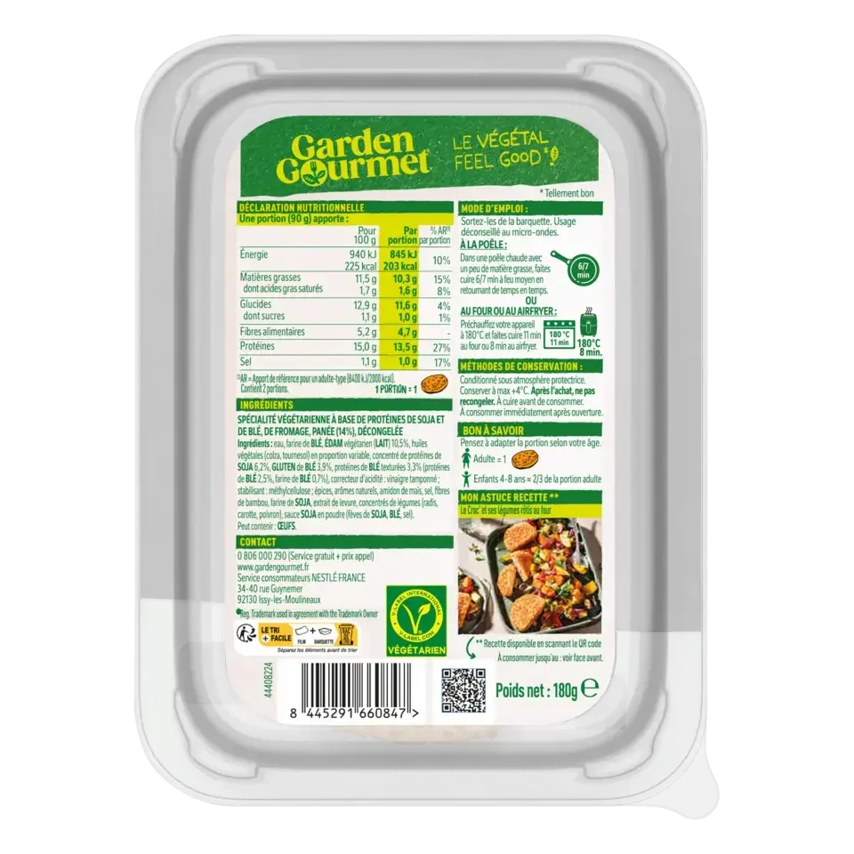 GARDEN GOURMET® : Le Végétal Feel Good* ! Régalez-vous avec notre délicieux Croc', source de protéines et de fibres et avec un Nutri-score A : une façon pratique et gourmande de mettre plus de végétal dans vos assiettes ! A retrouver au rayon traiteur végétal ! *Tellement bon.