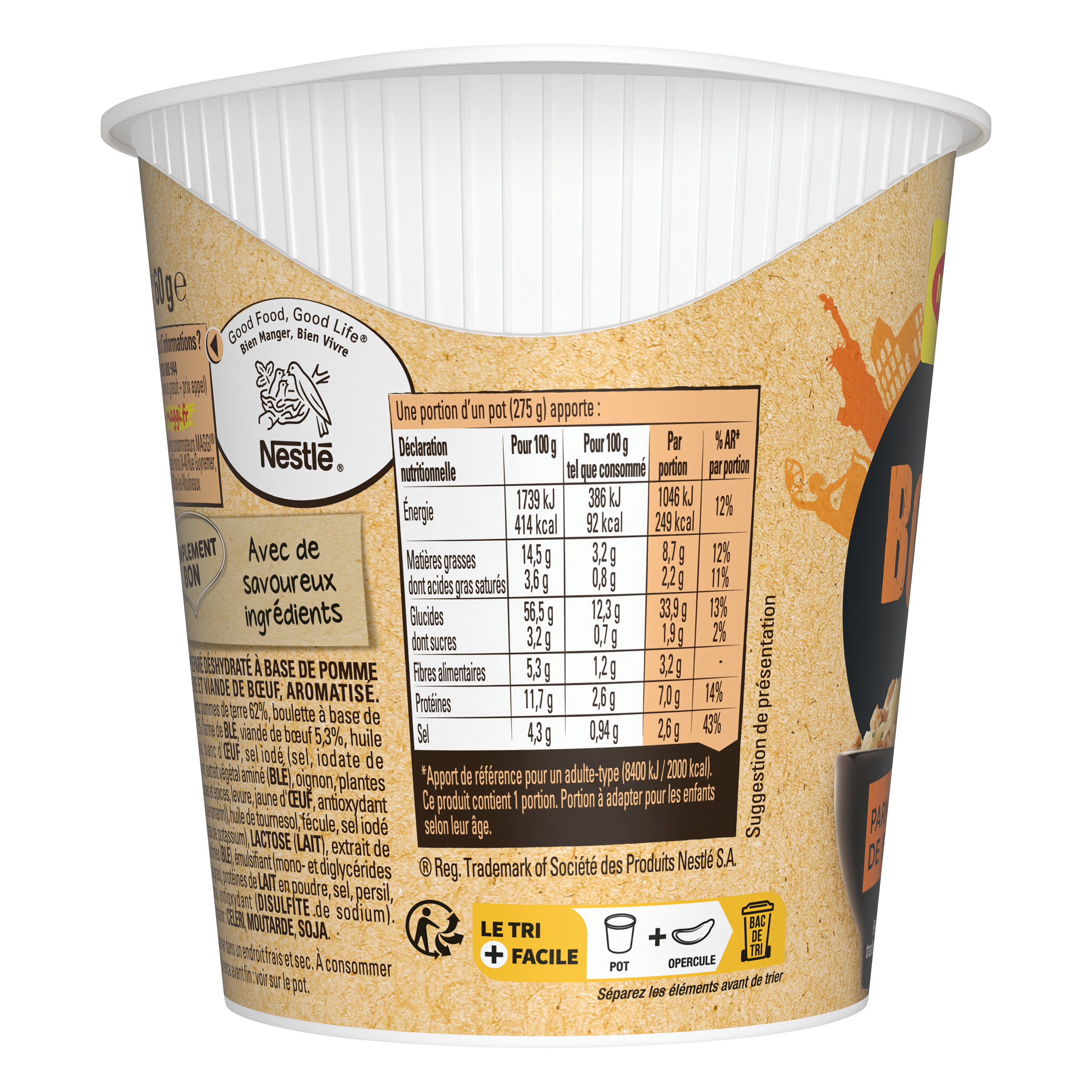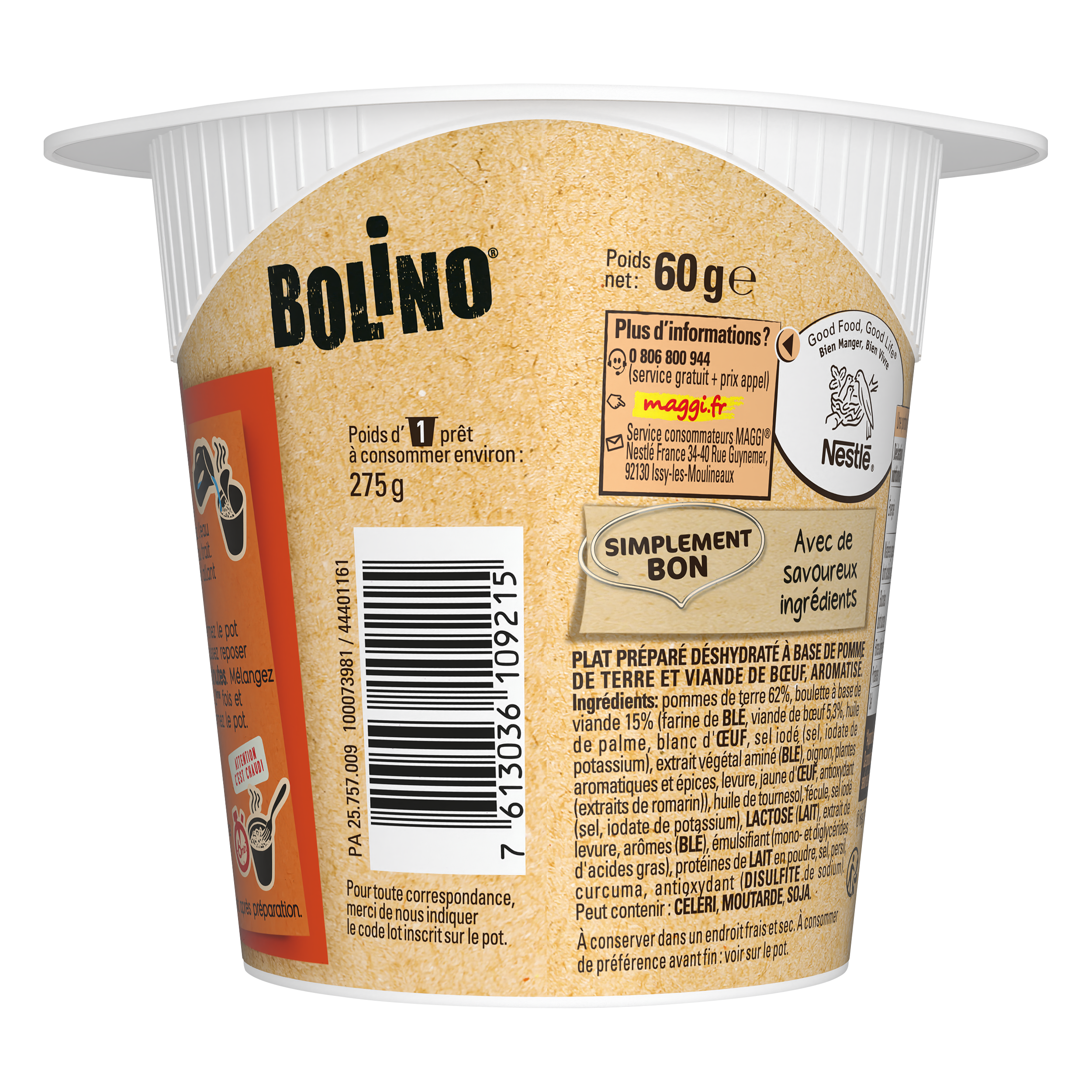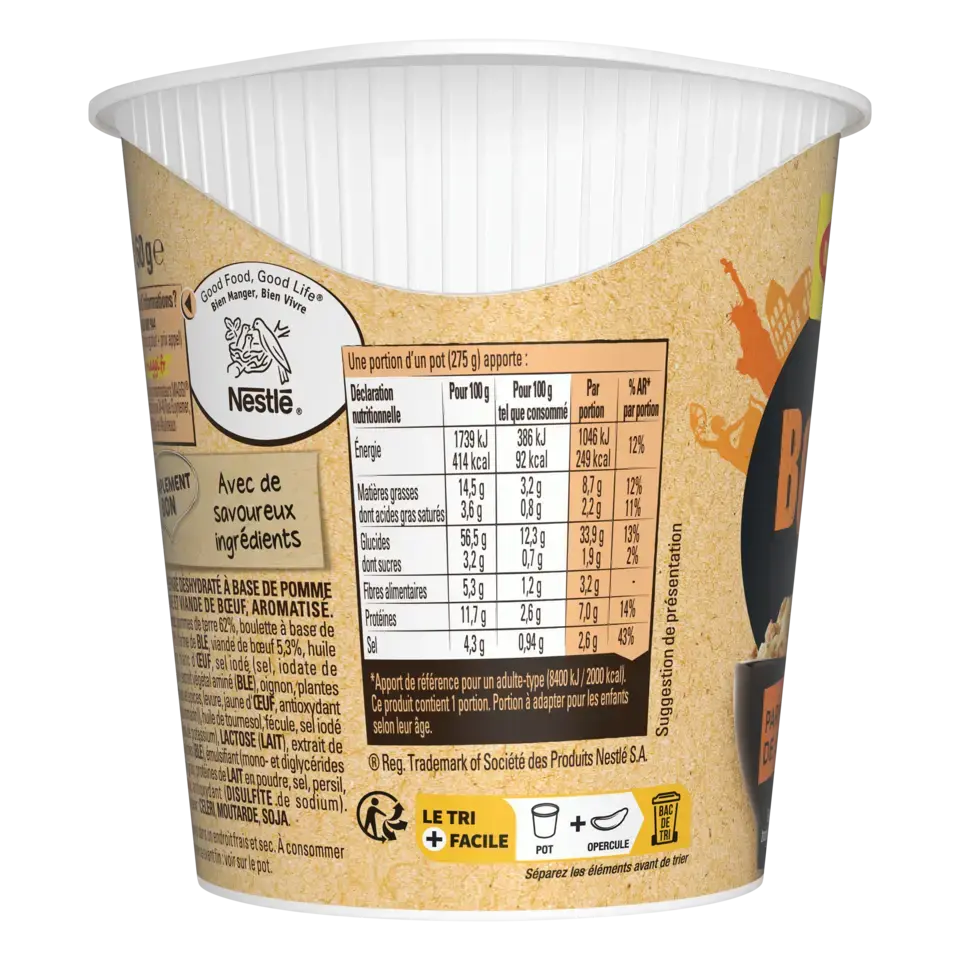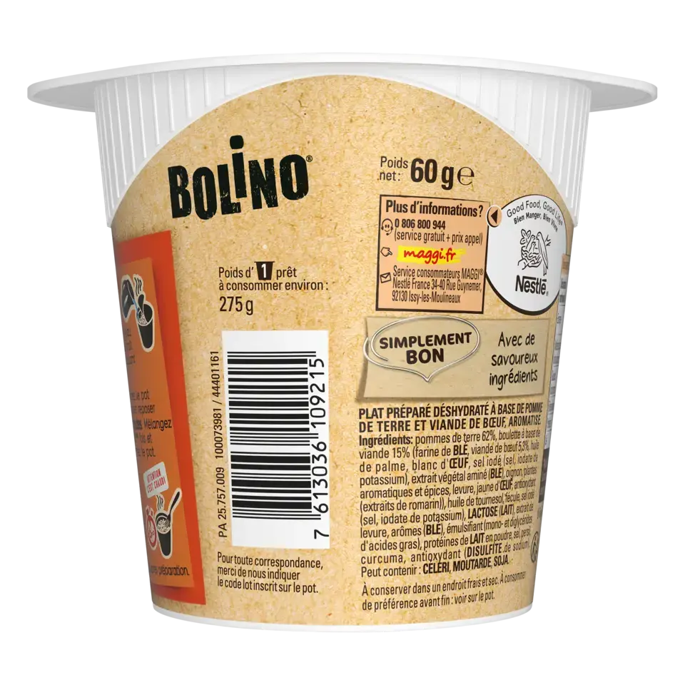 Ingrédients: Pomme de terre 62%, boulettes à base de viande 15% (farine de BLE, viande de bœuf 5.3%, huile de palme, blanc d'ŒUF, sel iodé (sel, iodate de potassium), extrait végétal aminé (BLE), oignons, plantes aromatiques et épices, levure, jaune d'ŒUF, antioxydant (extraits de romarin)), huile de tournesol, fécule, sel iodé (sel, iodate de potassium), LACTOSE (LAIT), extrait de levure, arôme (BLE), émulsifiant (mono- et diglycérides d'acides gras), protéines de LAIT en poudre, sel, persil, curcuma, antioxydant (DISULFITE de sodium. Peut contenir CELERI, MOUTARDE, SOJA.