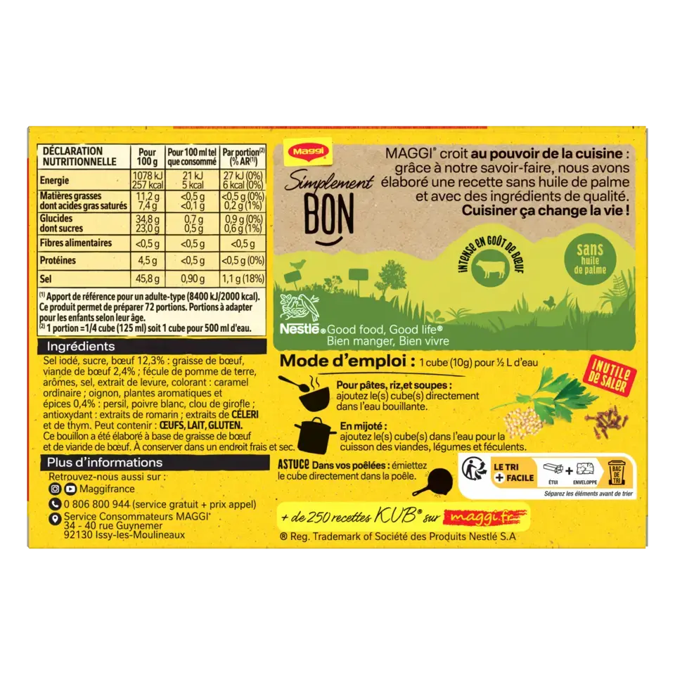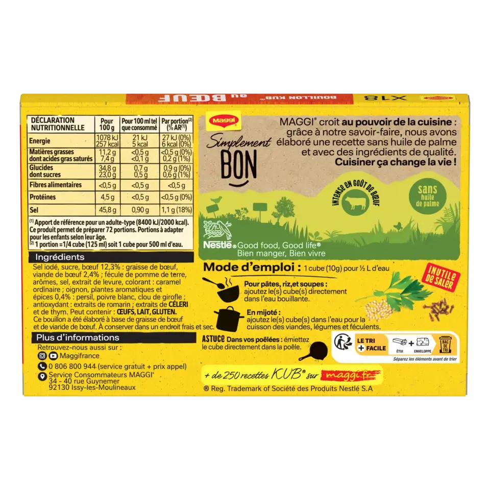 Ingrédients : sel iodé, sucre, bœuf 12,3% : graisse de bœuf, viande de bœuf 2,4% ; fécule de pomme de terre, arômes, sel, extrait de levure, colorant : caramel ordinaire ; oignon, plantes aromatiques et épices 0,4% : persil, poivre blanc, clou de girofle ; antioxydant : extraits de romarin ; extraits de CÉLERI et de thym. Peut contenir : ŒUFS, LAIT, GLUTEN.