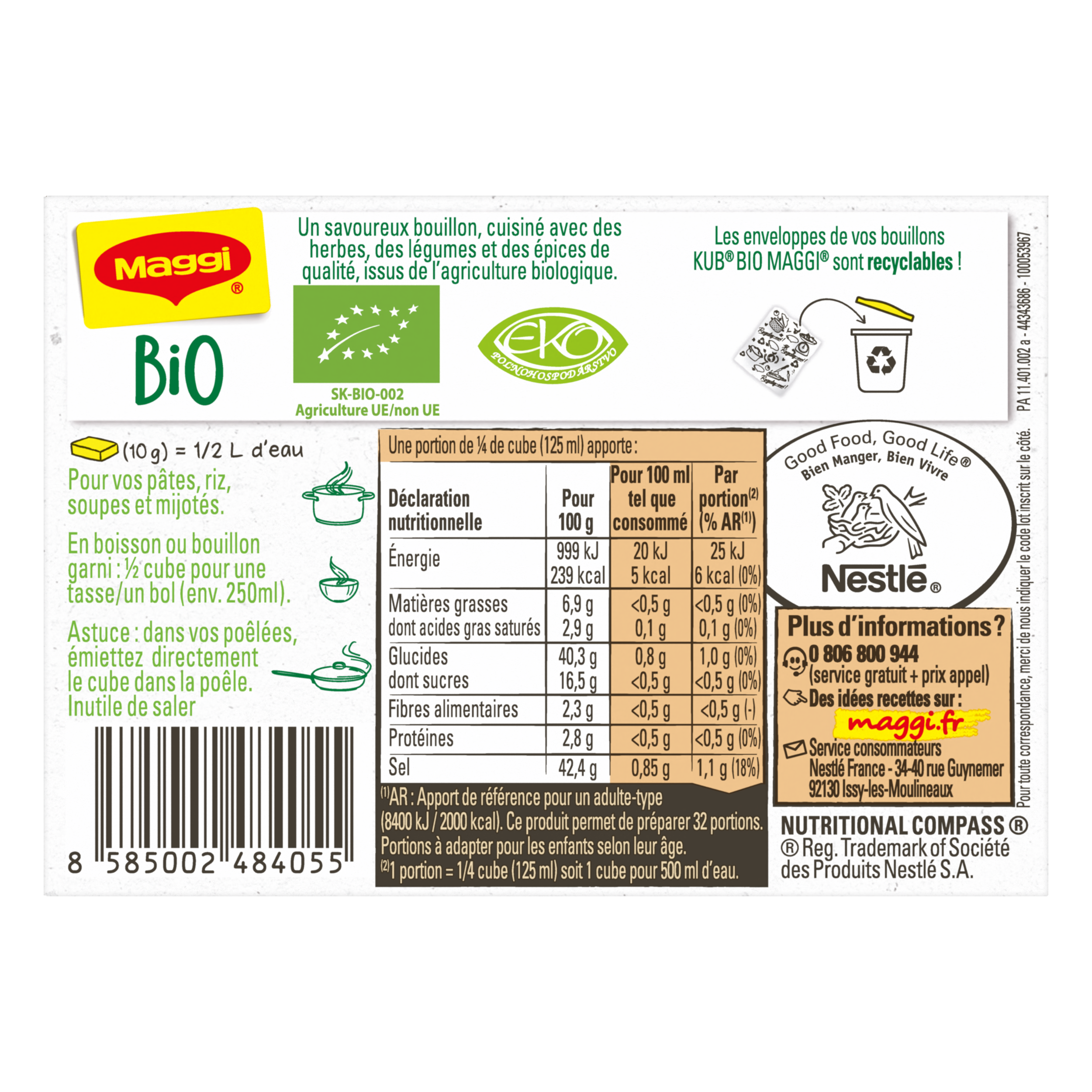 Tout le savoir-faire de MAGGI aussi en BIO ! Retrouvez en exclusivité le bon goût d'un bouquet garni dans votre petit cube en version BIO ! Avec son goût intense et cuisiné et ses ingrédients sélectionnés et de qualité, votre cube MAGGI BIO Bouquet Garni sera l'allié de toutes vos préparations quotidiennes : pâtes, riz, soupes, mijotés et autres poêlées de légumes. Le petit plus ? Ce bouillon est préparé avec du beurre de karité bio. Astuce : pour apporter une note fine et gourmande à vos poissons, émiettez les cubes directement sur leur dos avant cuisson. Les enveloppes de vos...