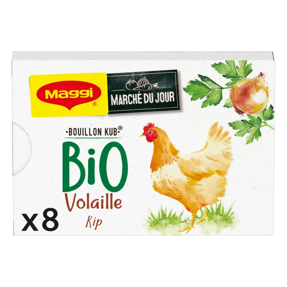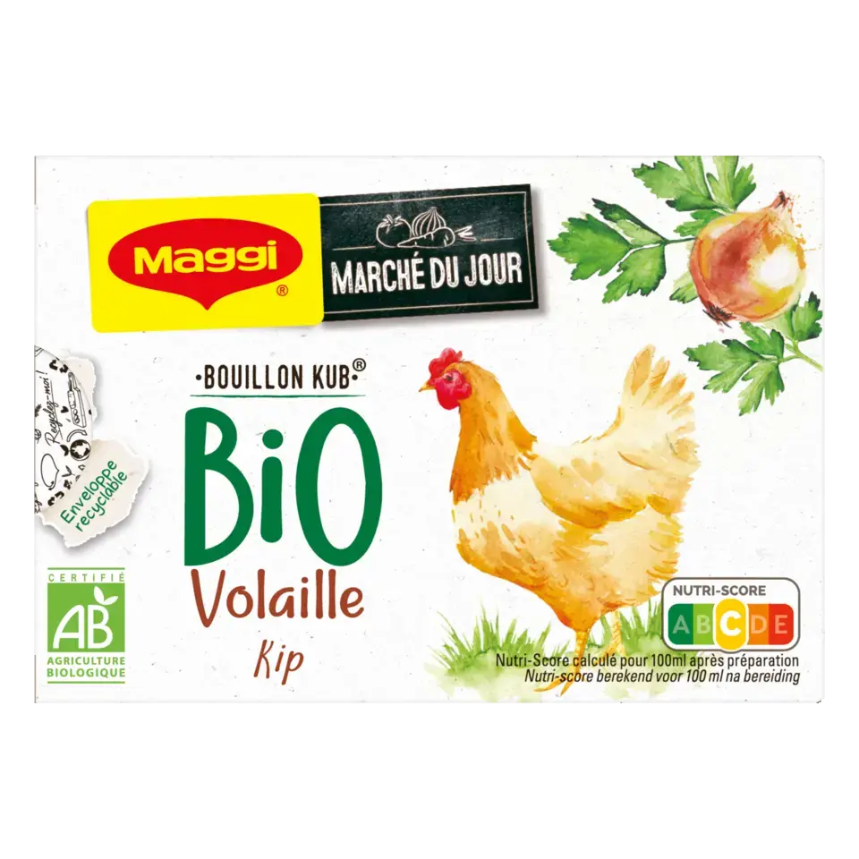 Ingrédients : sel de cuisine, fécule de pomme de terre*, sucre*, sirop de glucose*, beurre de karité*, viande cuite de poulet* 3,2%, extrait de levure*, arôme naturel de poulet, oignon* 1,3%, ail*, persil* 0,3%, curcuma*, arôme naturel d'oignon, poivre noir*, antioxydant : extraits de romarin* Peut contenir : CÉLERI, ŒUFS, POISSONS, GLUTEN, LAIT, SOJA. *Issu de l'agriculture biologique.