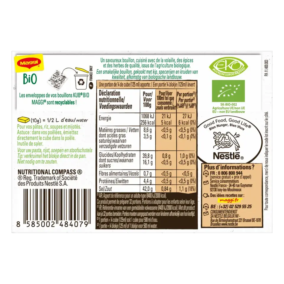 Tout le savoir-faire de MAGGI aussi en BIO ! Retrouvez le bon goût de volaille dans votre petit cube en version BIO ! Avec son goût intense et cuisiné et ses ingrédients sélectionnés et de qualité, votre MAGGI Bio Volaile sera l'allié de toutes vos préparations quotidiennes : pâtes, riz, soupes, mijotés et autres poêlées de légumes. Le petit plus ? Ce bouillon est préparé avec du beurre de karité bio. Astuce : pour apporter une note fine et gourmande à vos poissons, émiettez les cubes directement sur leur dos avant cuisson. Les enveloppes de vos MAGGI Bouillon KUB BIO Volaille sont en...