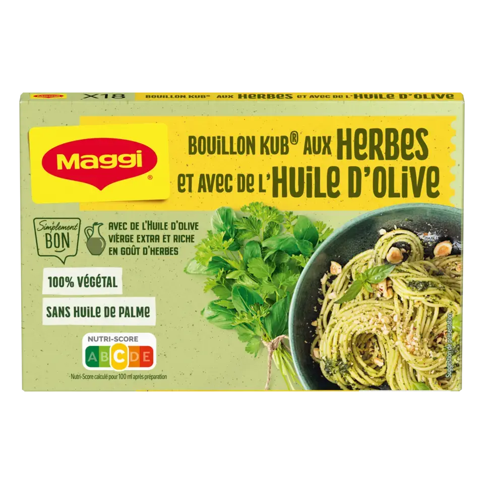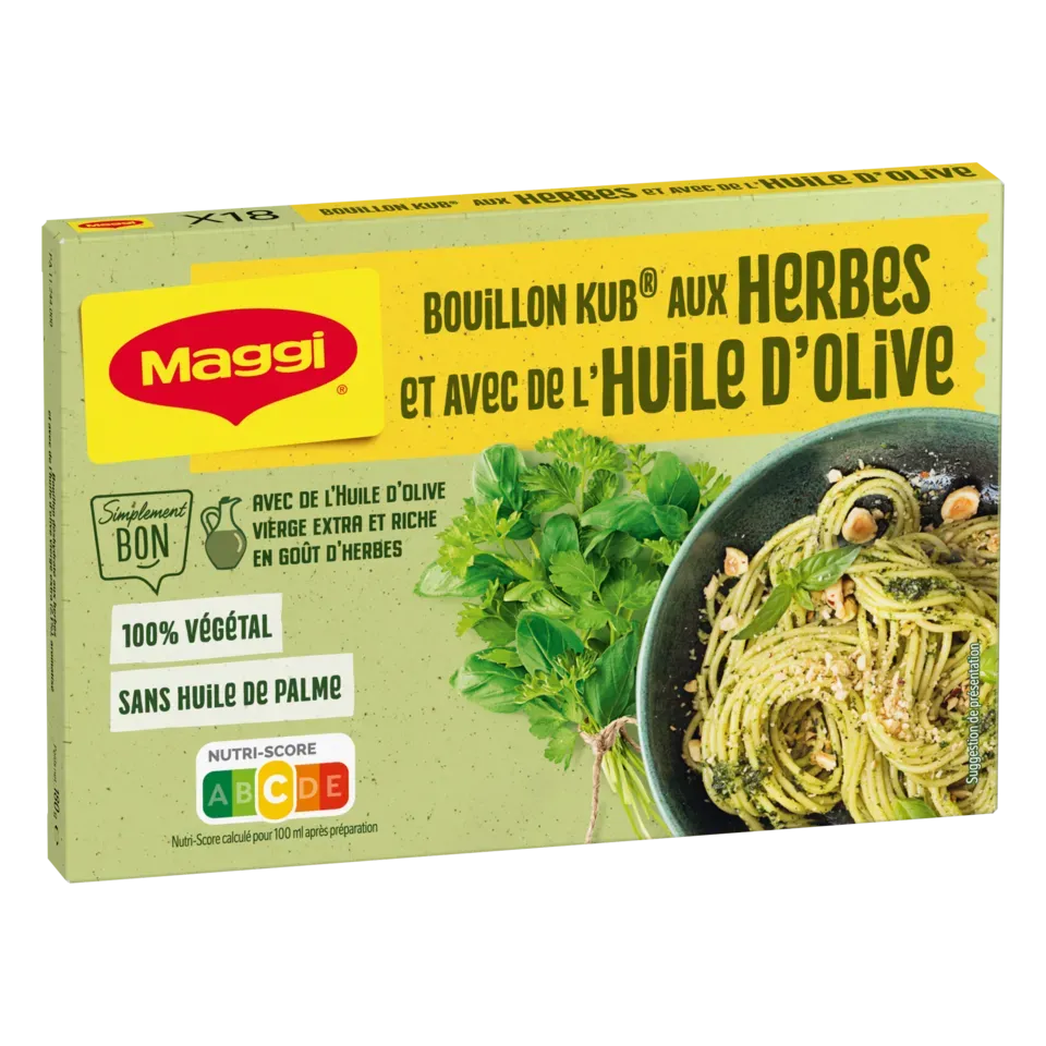Découvrez les nouveaux cubes de bouillon KUB HUILE D'OLIVE & HERBES de MAGGI®, une recette associant l'huile d'olive vierge extra et son riche goût en herbes pour un goût inimitable ! Bouillon 100% végétal* et sans huile de palme, ce petit cube deviendra votre allié dans la préparation de vos plats de pâtes et permettera de leur donner une délicieuse touche cuisinée ! Parfait pour les végétariens ! Pensez à les diluer ou les émietter dans vos préparations pour profiter de sa saveur authentique ! Astuce : Le Bouillon KUB Légumes de MAGGI® est idéal pour parfumer vos plats...