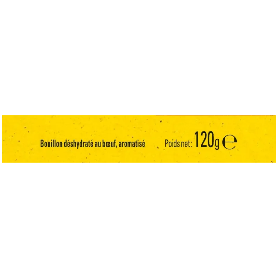 Ingrédients: Sel iodé, sucre, fécules, bœuf 8,7% : graisse de bœuf, jus de cuisson de viande de bœuf 2,2% ; légumes 4,3% : oignon 3%, carotte ; arômes, sel, plantes aromatiques et épices 0,9% : ail, persil, poivre blanc, clou de girofle ; colorant : caramel ordinaire ; extrait de levure, antioxydant : extraits de romarin ; extrait de CELERI. Peut contenir : œufs, lait, gluten.
