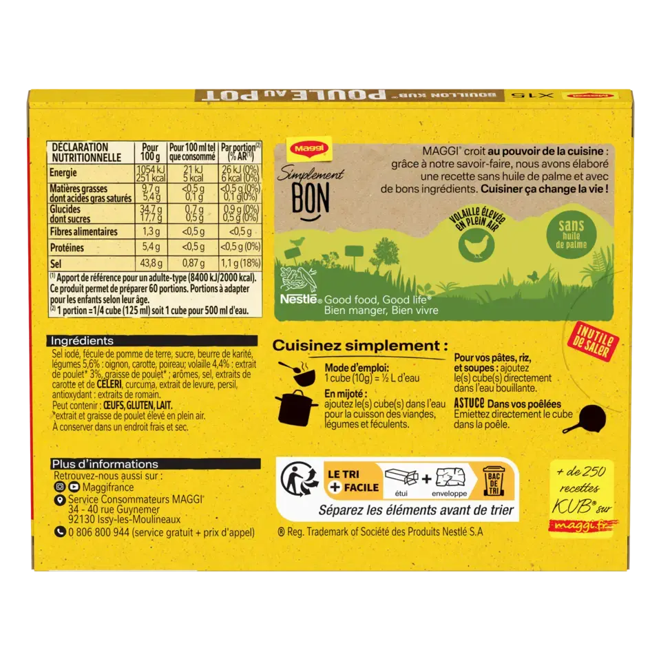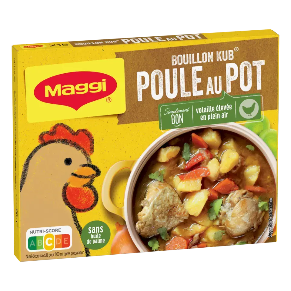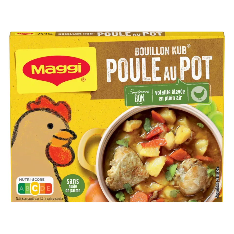 Découvrez le bouillon KUB Poule au Pot de MAGGI ! Une recette riche en goût, préparée à partir de volaille élevée en plein air et de légumes savoureux (oignons, carottes, poireaux, navets) qui rehaussera en un instant vos viandes blanches, vos consommés, vos légumineuses ou vos poêlées de légumes, en leur donnant un bon goût de volaille cuisinée et de légumes. Recette avec de bons ingrédients et sans huile de palme.