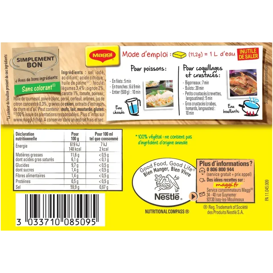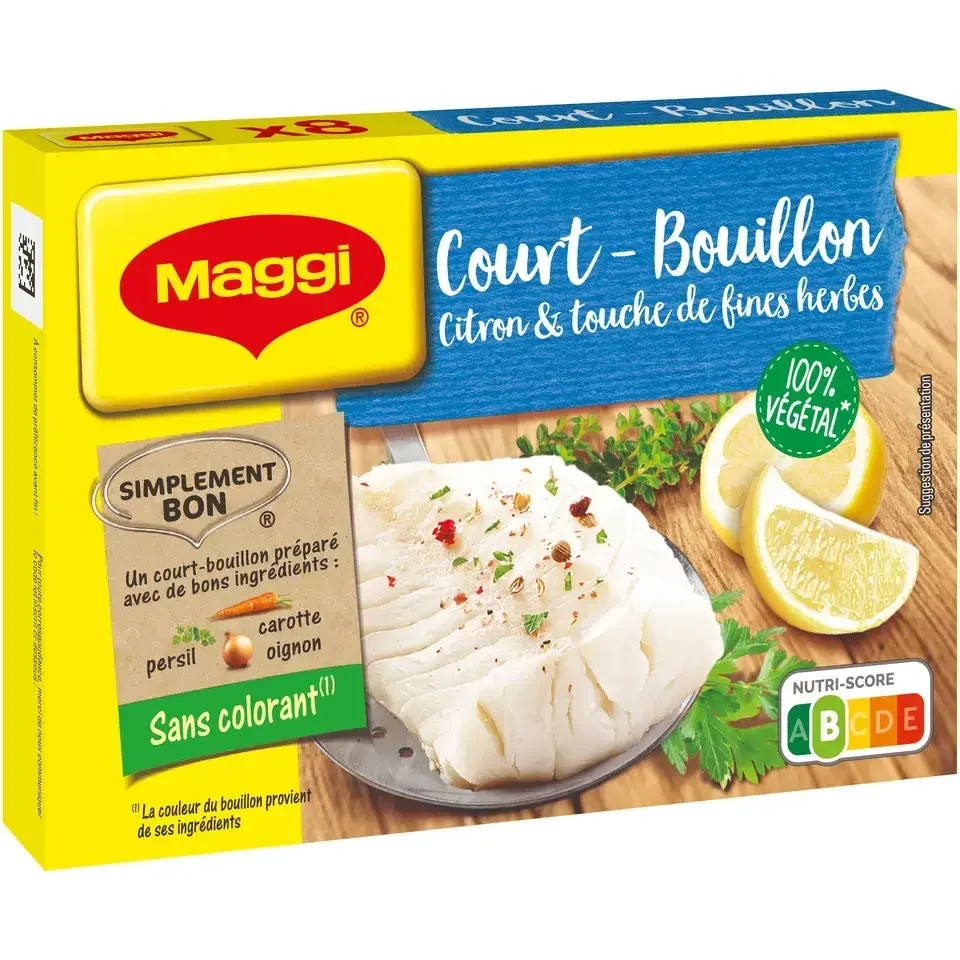 Donnez une note délicate et parfumée à vos poissons et crustacés avec le Court-bouillon Citron et touche de fines herbes de MAGGI. Rien de tel pour donner de la fraîcheur et sublimer vos plats . Découvrez dès maintenant ce petit cube de bouillon 100% végétal* au goût subtil de citron et fines herbes ! * Ne contient pas d'ingrédient d'origine animale.