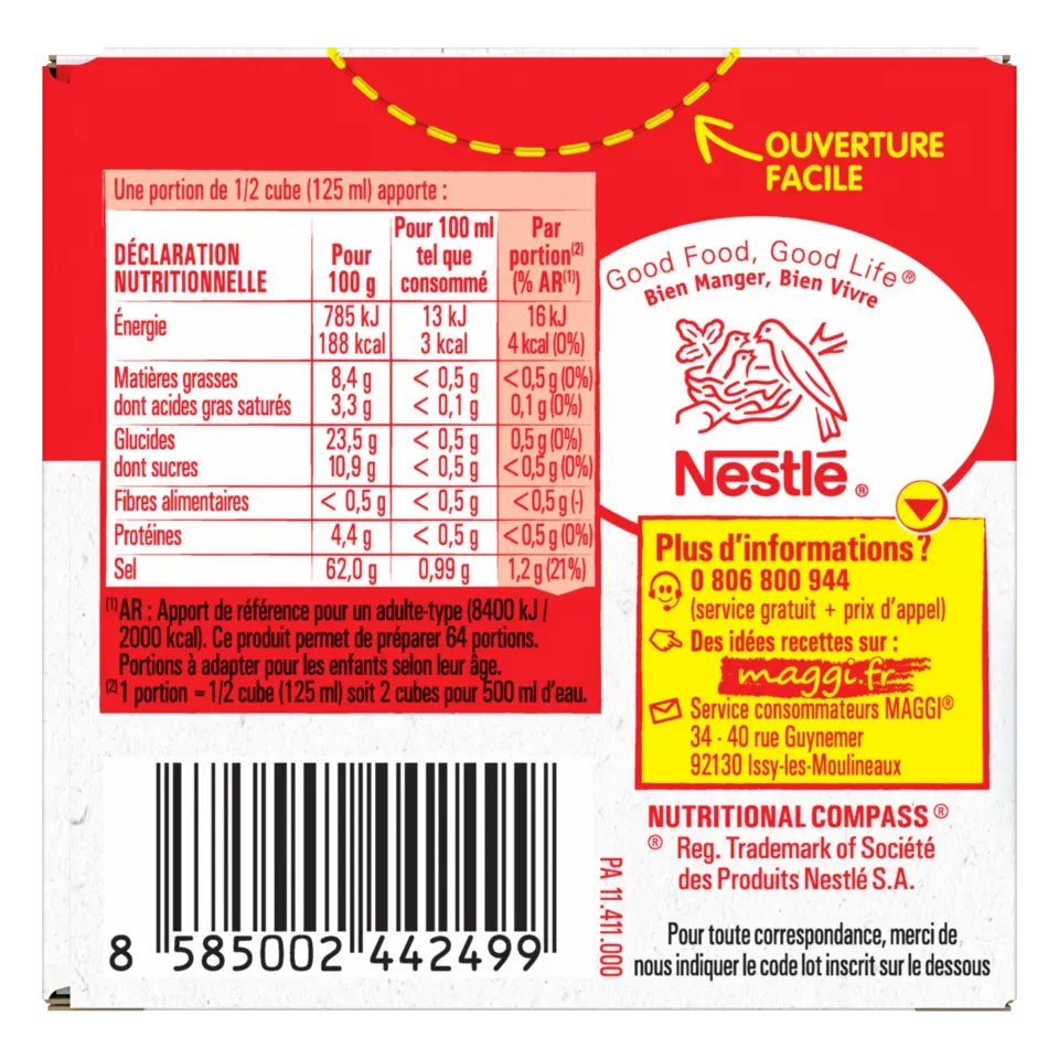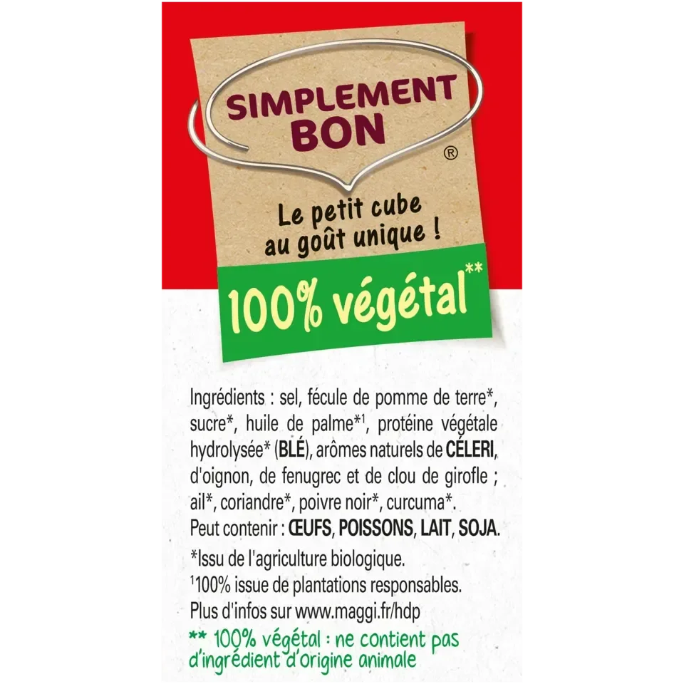 Ingrédients : Sel, fécule de pomme de terre*, sucre*, huile de palme* ¹, protéine végétale hydrolysée* (BLÉ), arômes naturels de CÉLERI, d'oignon, de fenugrec et de clou de girofle ; ail*, coriandre*, poivre noir*, curcuma*. Peut contenir : ŒUFS, POISSONS, LAIT, SOJA. *Issu de l'agriculture biologique. ¹100% issue de plantations responsables. Plus d'infos sur www.maggi.fr/hdp.