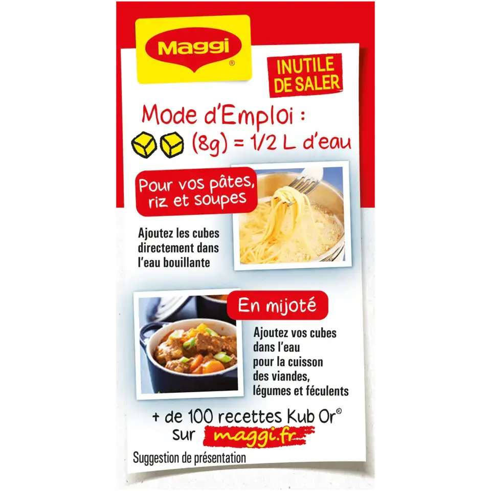 Découvrez le bouillon KUB OR Bio*, le goût inimitable de KUB OR de MAGGI avec des produits issus de l'agriculture biologique. Il vous permettra de rehausser le goût de vos plats! Les recettes MAGGI sont développées avec soin par les chefs cuisiniers MAGGI. En s'inspirant du fait maison, ces bouillons sont élaborés à partir d'épices, d'herbes et de sel. La forme déshydratée de ces ingrédients permet une bonne conservation dans le temps des bouillons. Une fois mélangés, les ingrédients sont compressés dans un moule qui leur donne leur forme de cube : vous n'avez plus...
