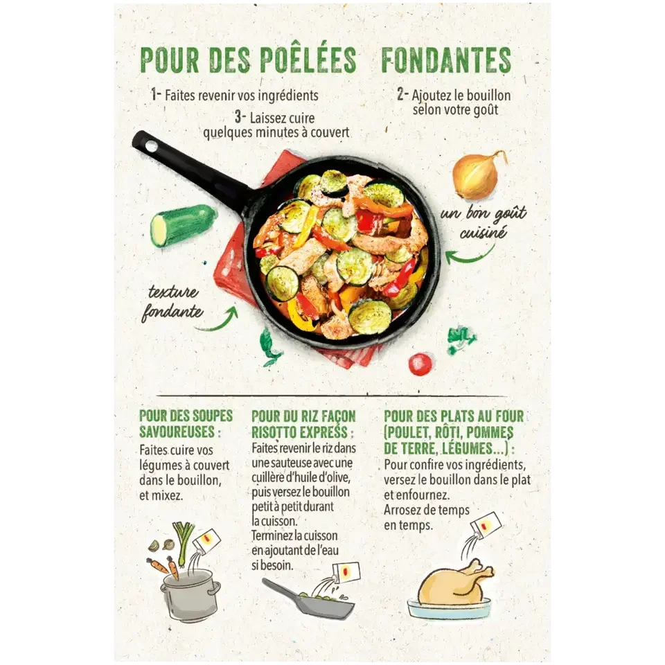 Ingrédients: Bouillon de légumes (eau, oignon 3%, carotte 1,5%, CELERI 0,6%, huile d'olive vierge extra), eau, jus de légumes concentrés 1,7% (poireau, carotte, panais, CELERI, CELERI-rave), sel marin, arôme naturel, persil laurier en poudre, extrait de levure, clou de girofle en poudre.