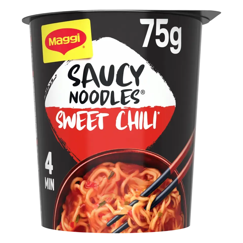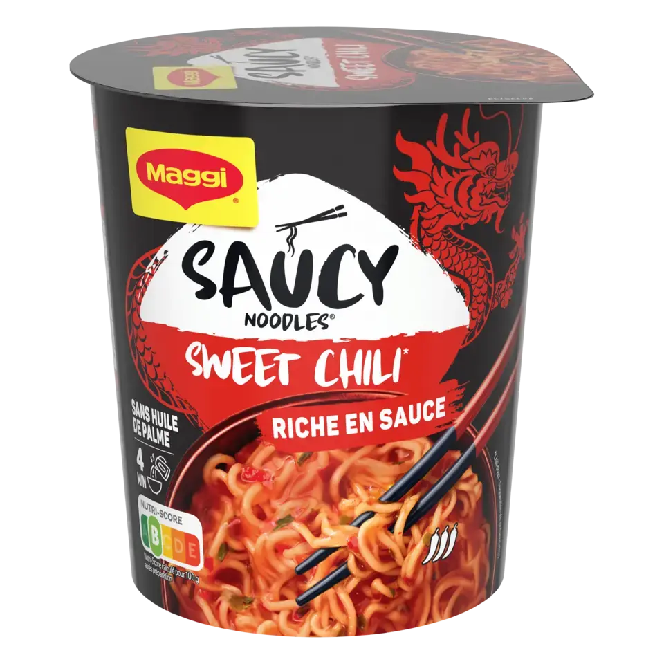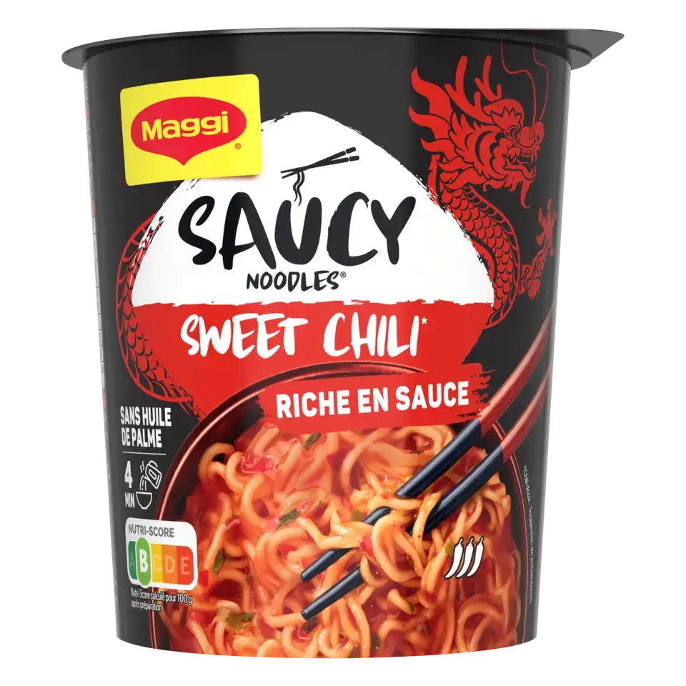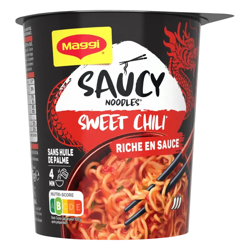 Découvrez la nouvelle gamme de nouilles instantanées SAUCY NOODLES® de MAGGI® et voyagez au travers des saveurs phares de l'Asie ! Laissez-vous tenter par la saveur sweet chili*. Cette recette épicée, à base de piments et de paprika, est inspirée de la tradition culinaire chinoise. Un plat préparé de nouilles instantanées et riche en sauce, prêt en 4 minutes et dans un format cup** pratique à emporter. SANS HUILE DE PALME .*Chili doux.** pot
