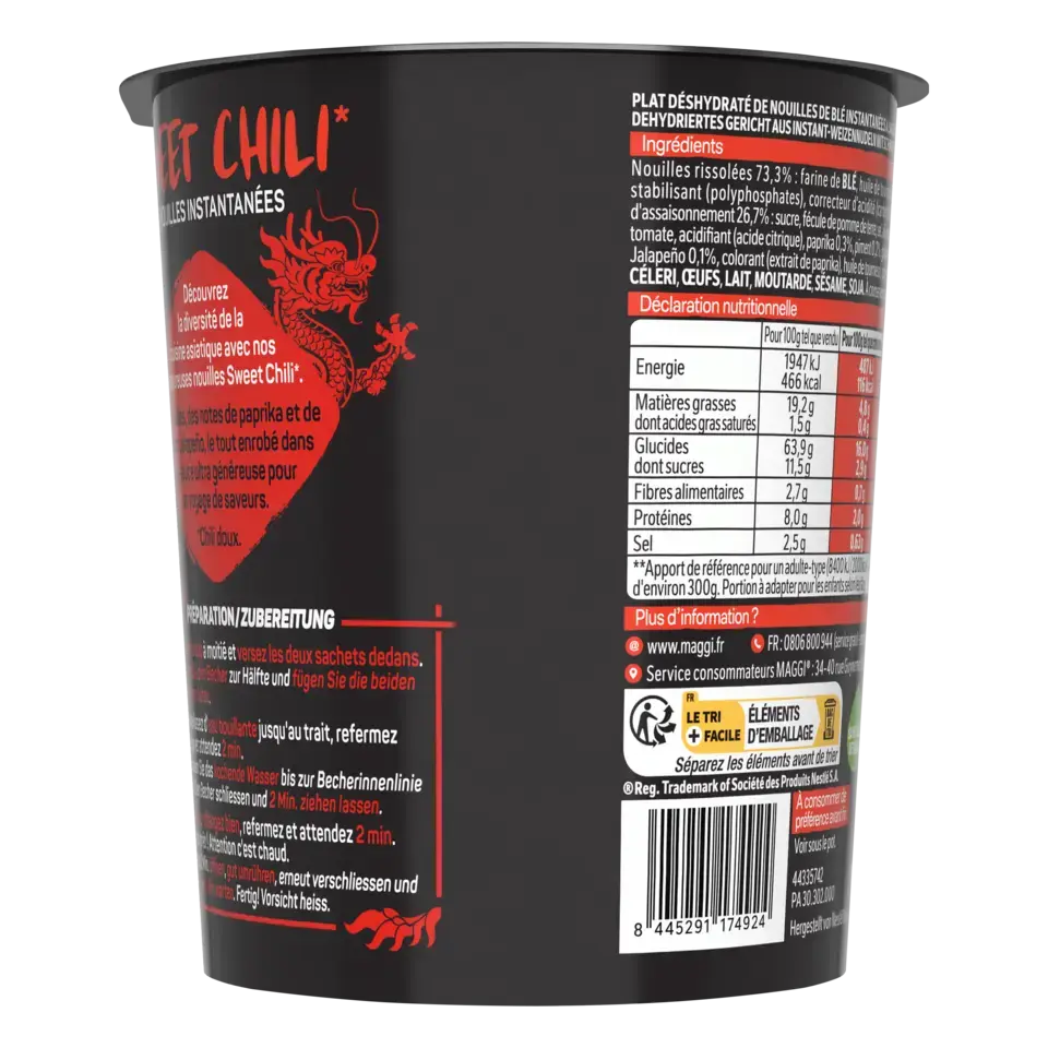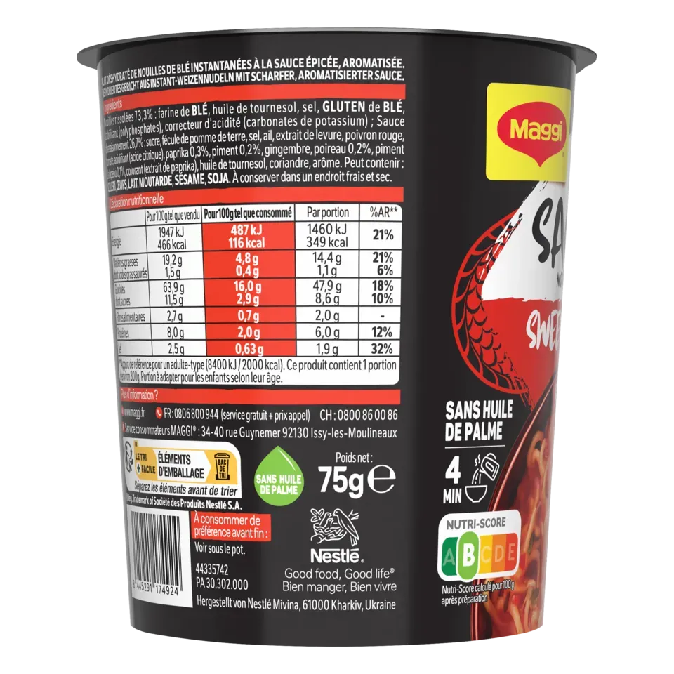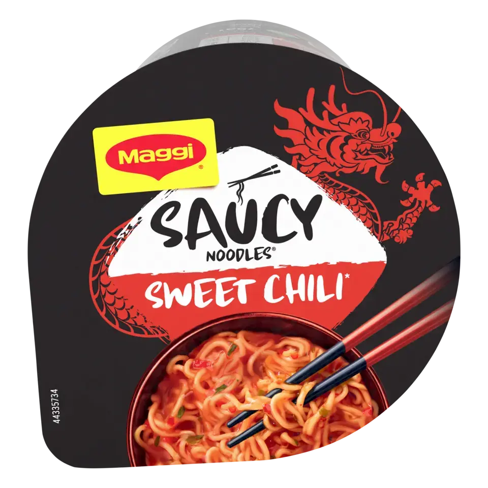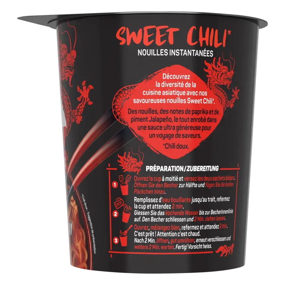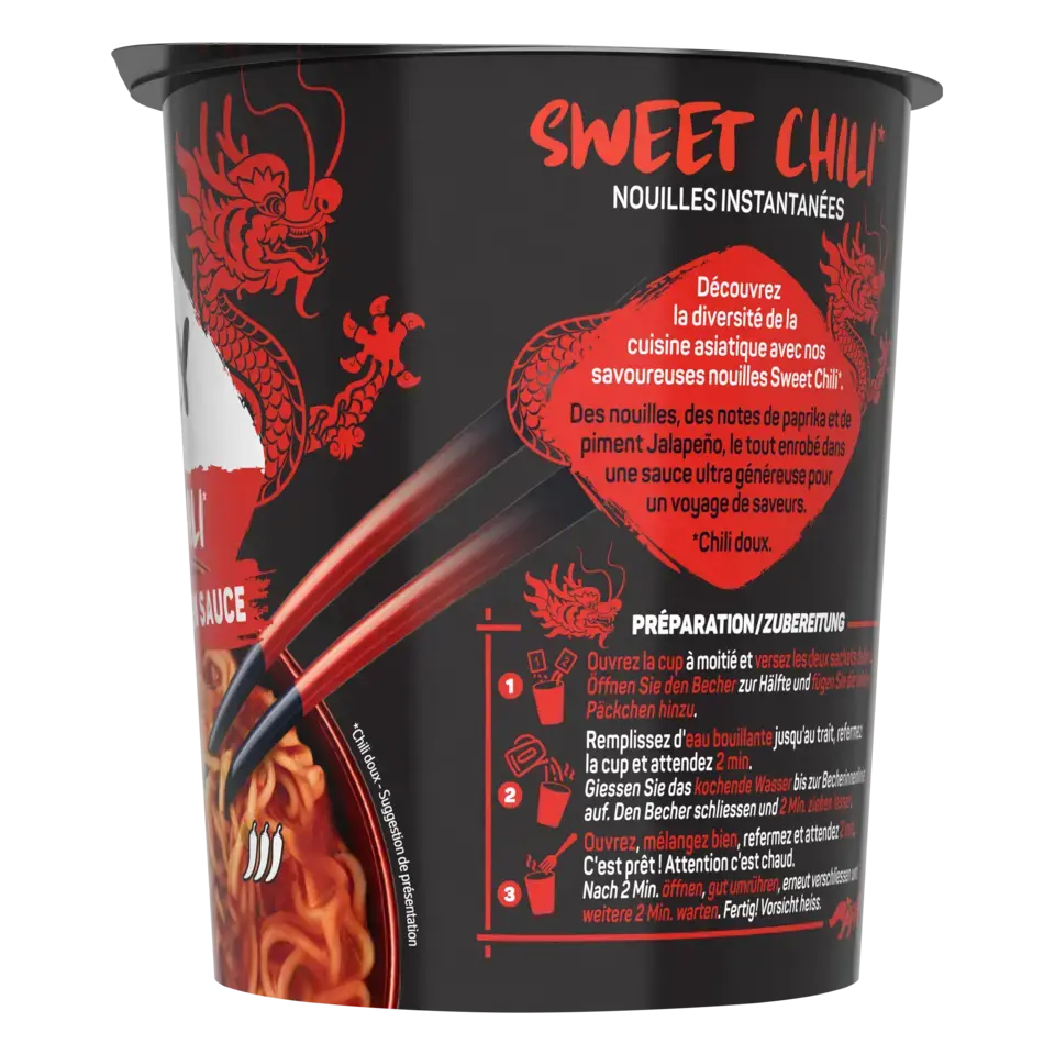 Découvrez la nouvelle gamme de nouilles instantanées SAUCY NOODLES® de MAGGI® et voyagez au travers des saveurs phares de l'Asie ! Laissez-vous tenter par la saveur sweet chili*. Cette recette épicée, à base de piments et de paprika, est inspirée de la tradition culinaire chinoise. Un plat préparé de nouilles instantanées et riche en sauce, prêt en 4 minutes et dans un format cup** pratique à emporter. SANS HUILE DE PALME .*Chili doux.** pot