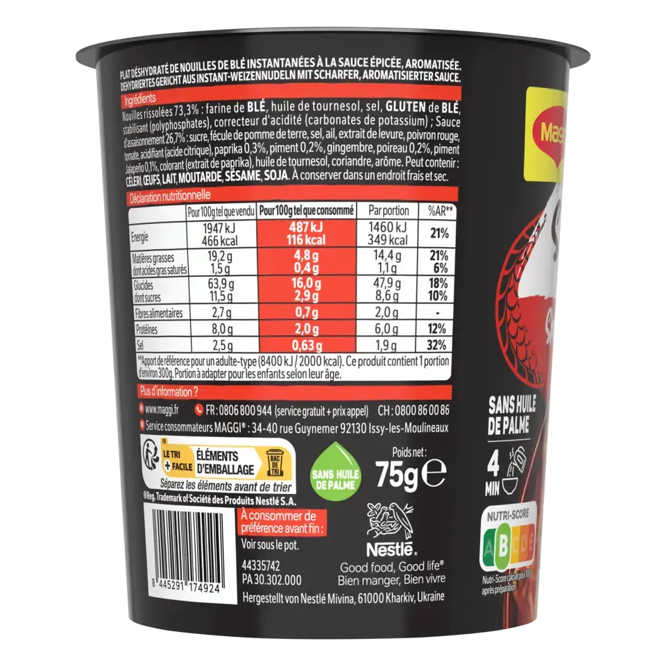 Ingrédients : Nouilles rissolées 73,3% : farine de BLÉ, huile de tournesol, sel, GLUTEN de BLÉ, stabilisant (polyphosphates de sodium), correcteur d'acidité (carbonates de potassium) ; Sauce d'assaisonnement 26,7% : sucre, fécule de pomme de terre, sel, ail, extrait de levure, poivron rouge, tomate, acidifiant (acide citrique), paprika 0,3%, piment 0,2%, gingembre, poireau 0,2%, piment Jalapeño 0,1%, colorant (extrait de paprika), huile de tournesol, coriandre, arôme. Peut contenir : CÉLERI, OEUFS, LAIT, MOUTARDE, SÉSAME, SOJA.
