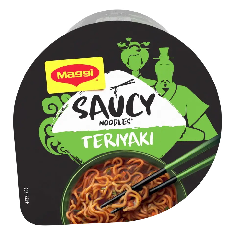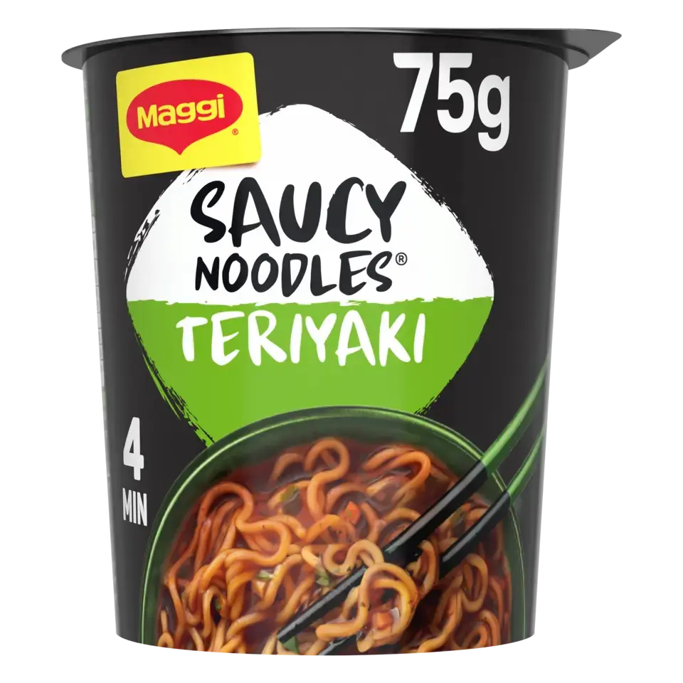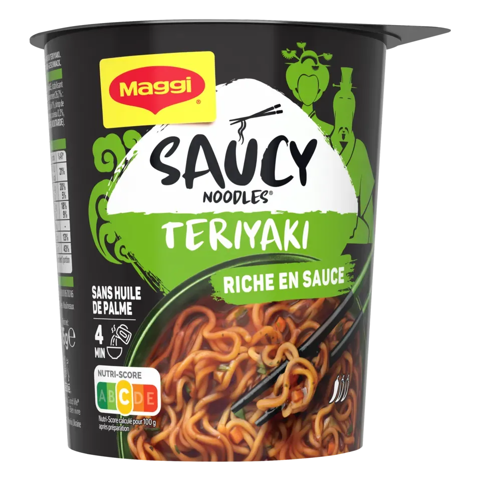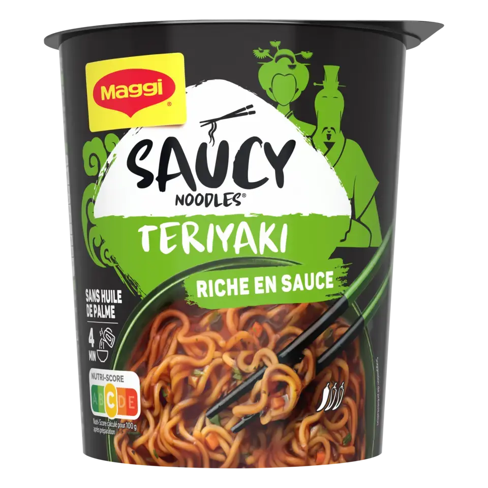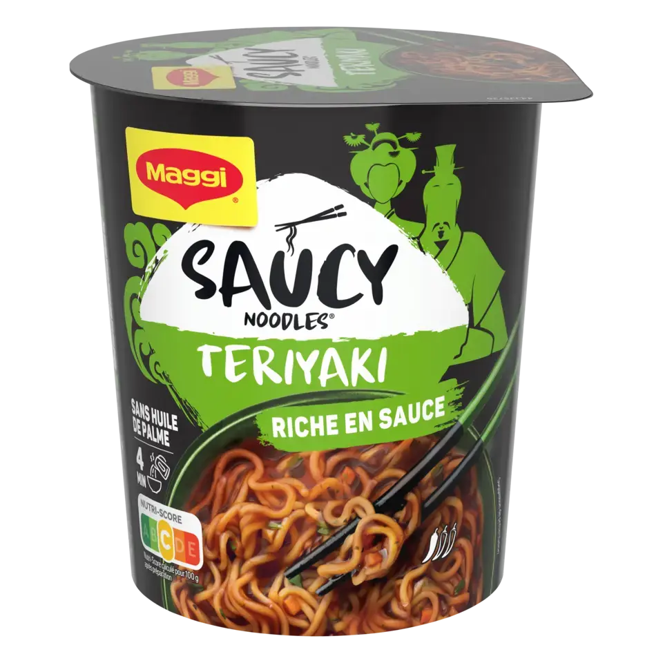 Découvrez la nouvelle gamme de nouilles instantanées SAUCY NOODLES® de MAGGI® et voyagez au travers des saveurs phares de l'Asie ! Laissez-vous tenter par la saveur teriyaki. Cette recette aux notes d'ail et de gingembre est inspirée de la tradition culinaire japonaise. Un plat préparé de nouilles instantanées et riche en sauce, prêt en 4 minutes et dans un format cup* pratique à emporter. SANS HUILE DE PALME .*pot