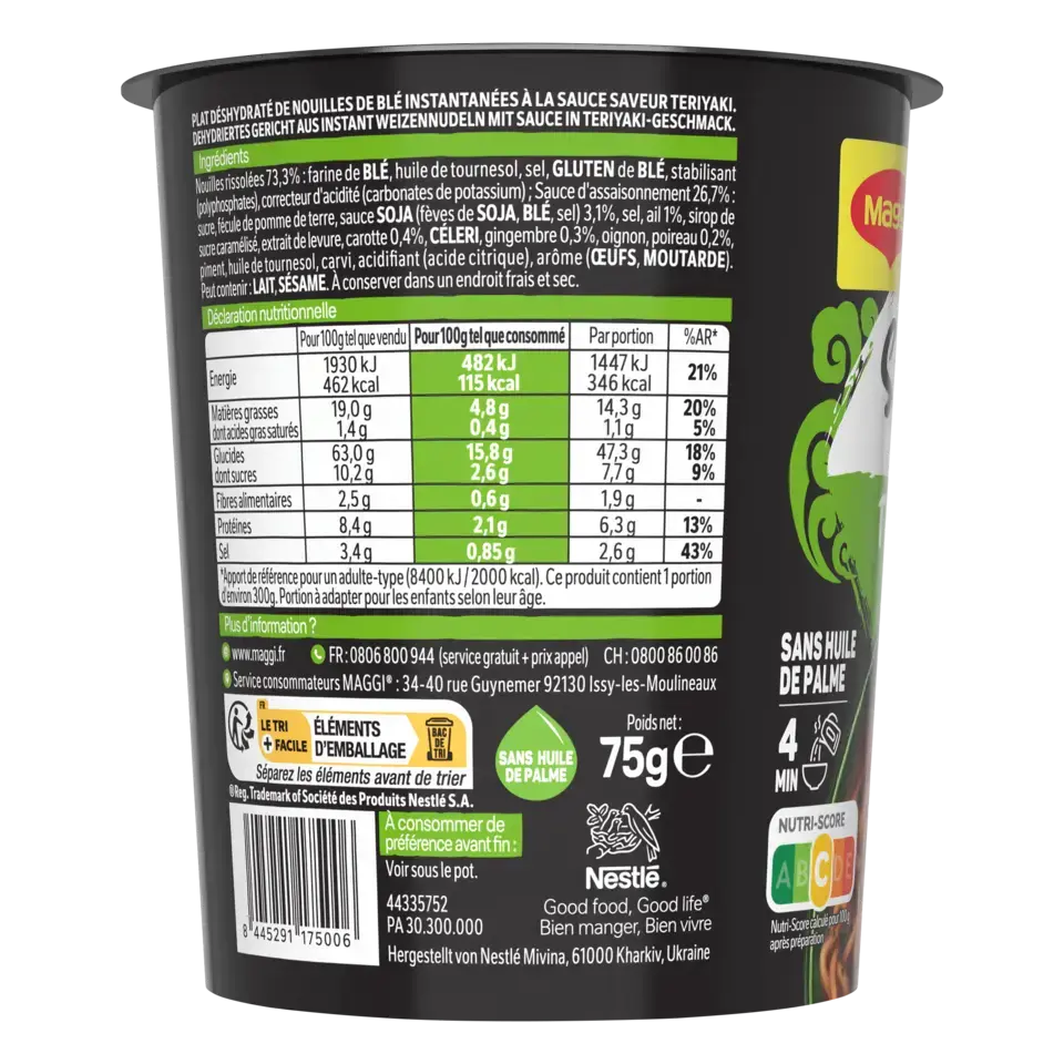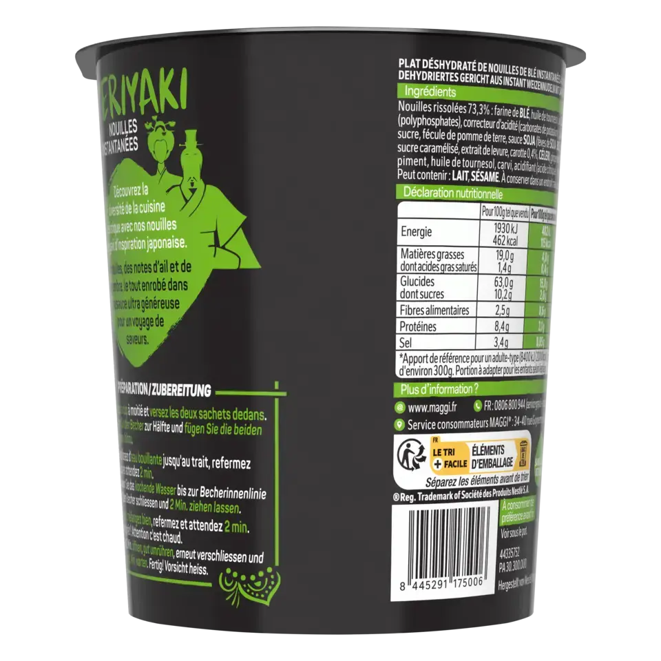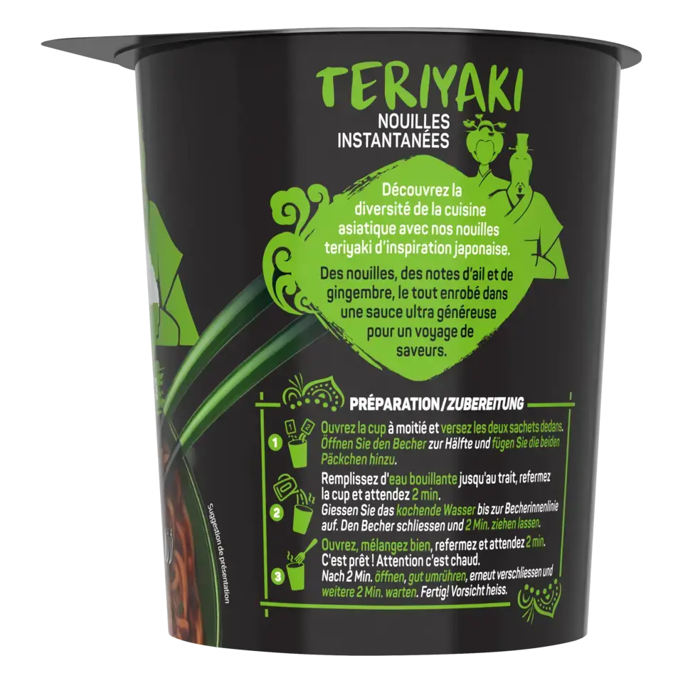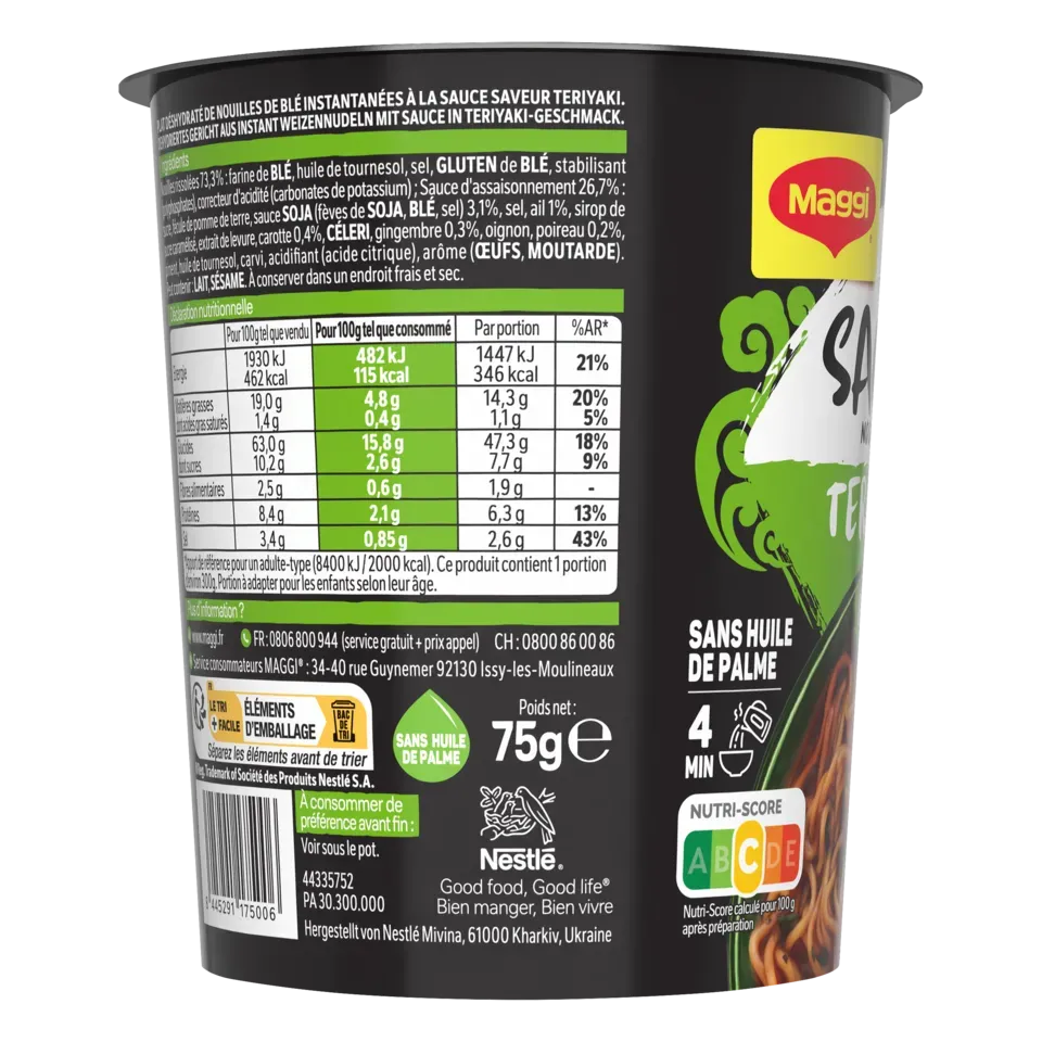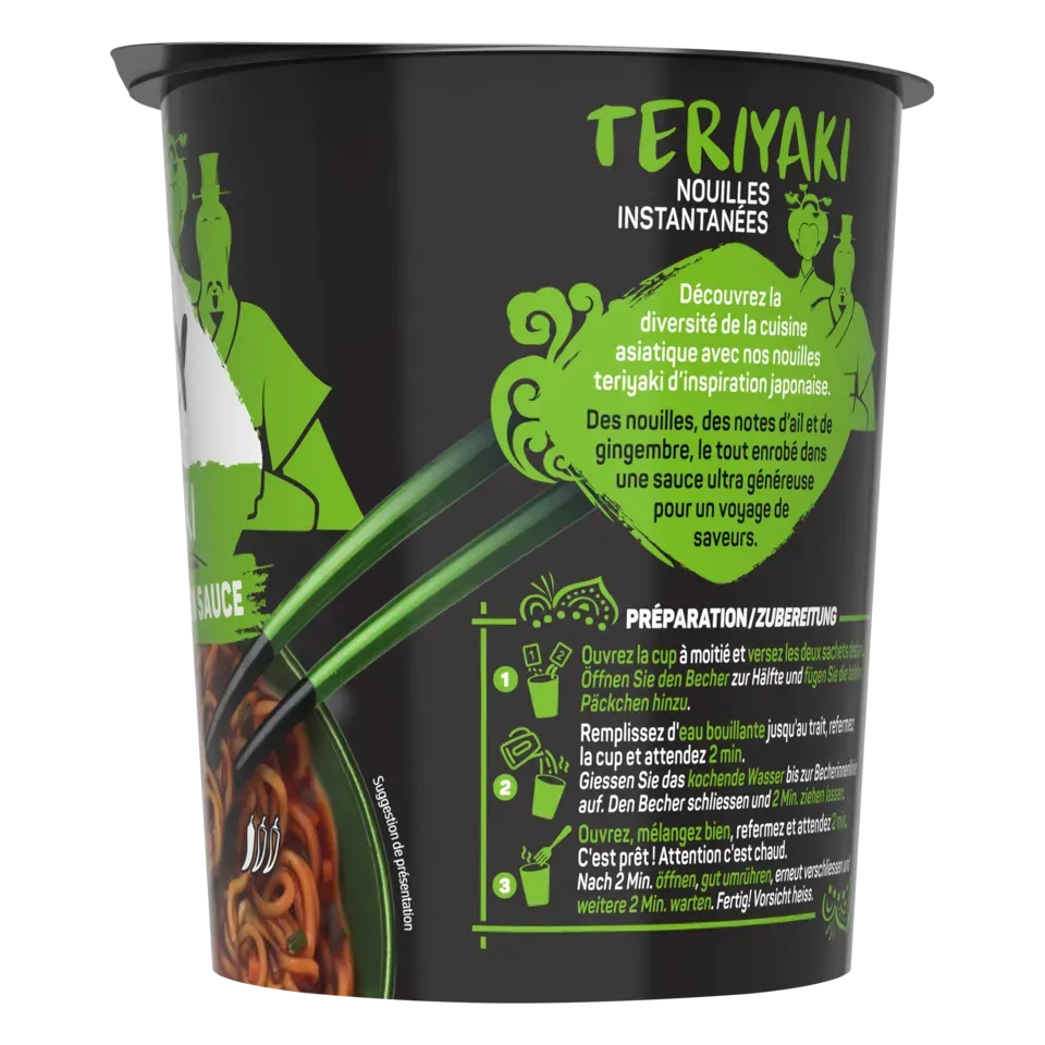 Découvrez la nouvelle gamme de nouilles instantanées SAUCY NOODLES® de MAGGI® et voyagez au travers des saveurs phares de l'Asie ! Laissez-vous tenter par la saveur teriyaki. Cette recette aux notes d'ail et de gingembre est inspirée de la tradition culinaire japonaise. Un plat préparé de nouilles instantanées et riche en sauce, prêt en 4 minutes et dans un format cup* pratique à emporter. SANS HUILE DE PALME .*pot