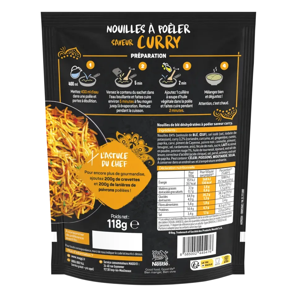 Découvrez la nouvelle gamme de nouilles à poêler MAGGI® et embarquez pour un voyage culinaire à travers les saveurs emblématiques de l'Asie ! Laissez-vous séduire par la richesse de nos nouilles saveur Curry. Un plat pour 2 personnes, et prêt en seulement 7 minutes.