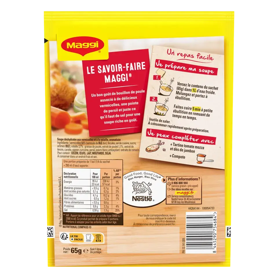 Le savoir-faire MAGGI : un recette qui associe le bon goût du bouillon de poule avec de délicieux vermicelles et une pointe de persil, et juste ce qu'il faut de sel pour une soupe riche en goût. Avec MAGGI, retrouvez tout le plaisir d'un bon bouillon aux vermicelles, prêt en 5 minutes seulement. Régalez-vous !