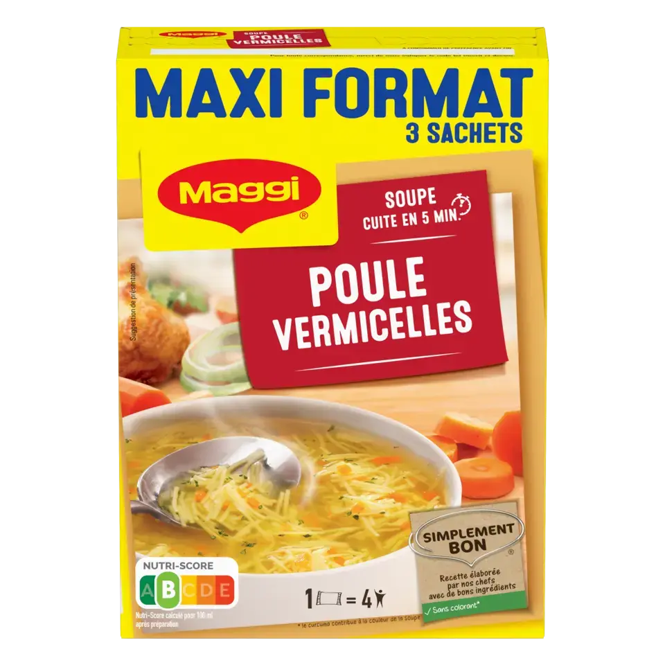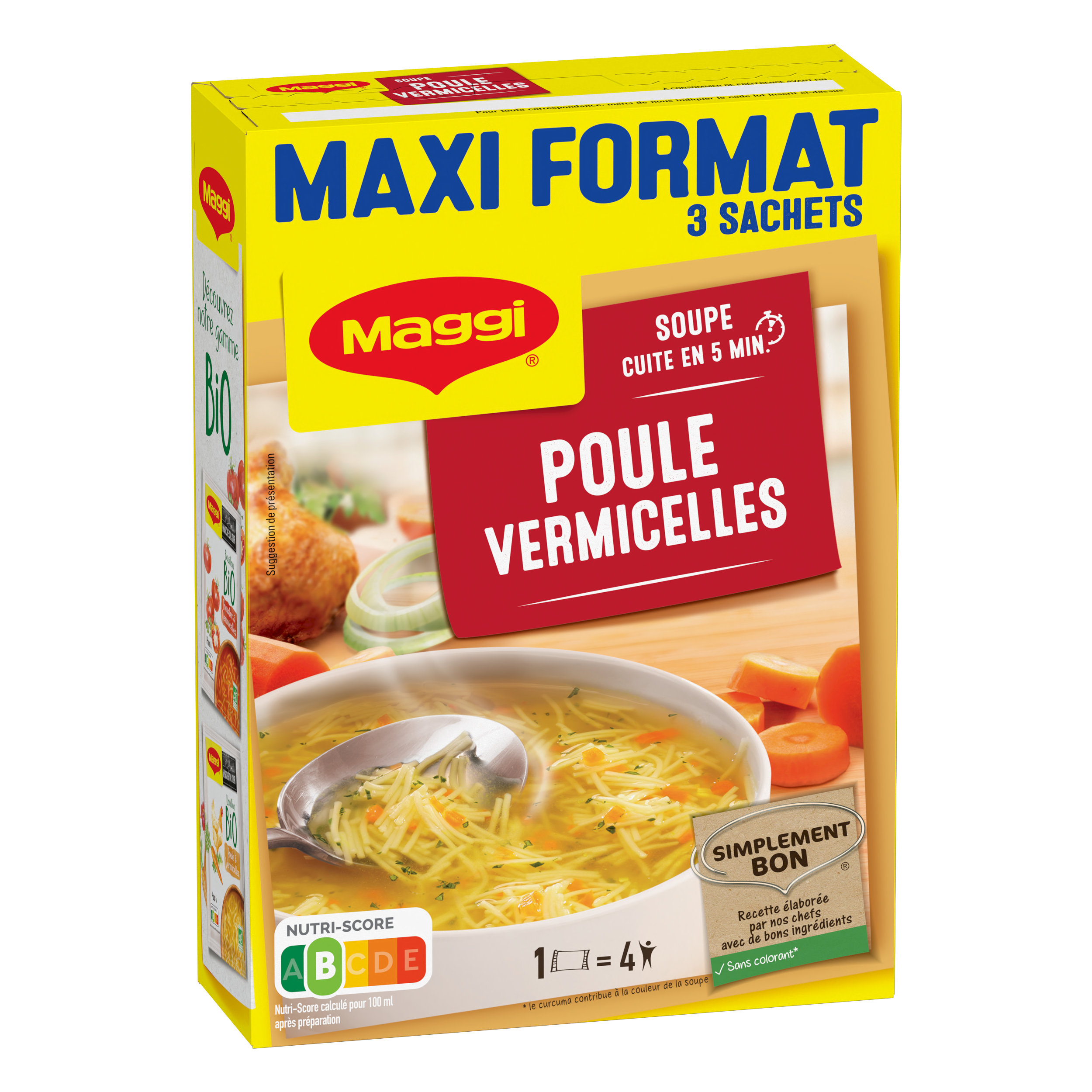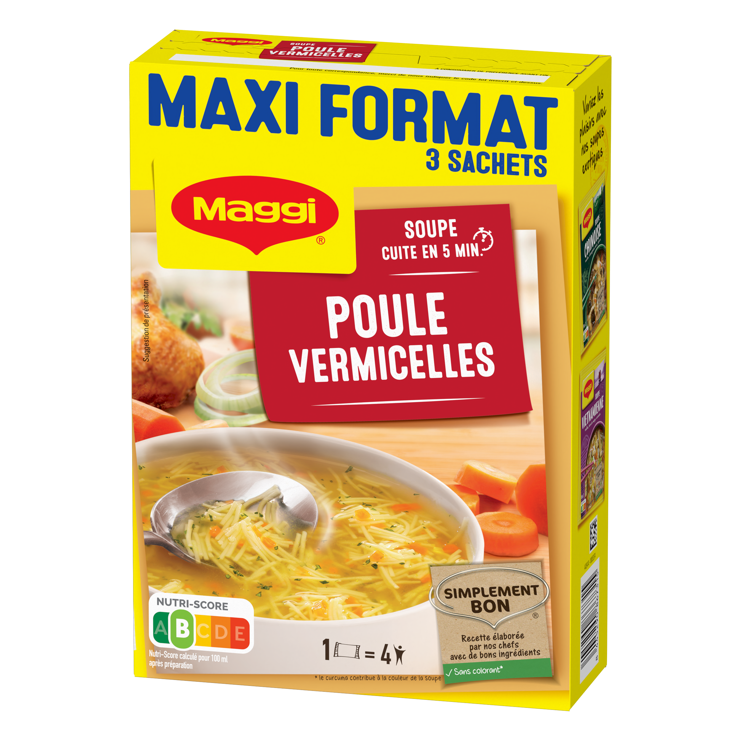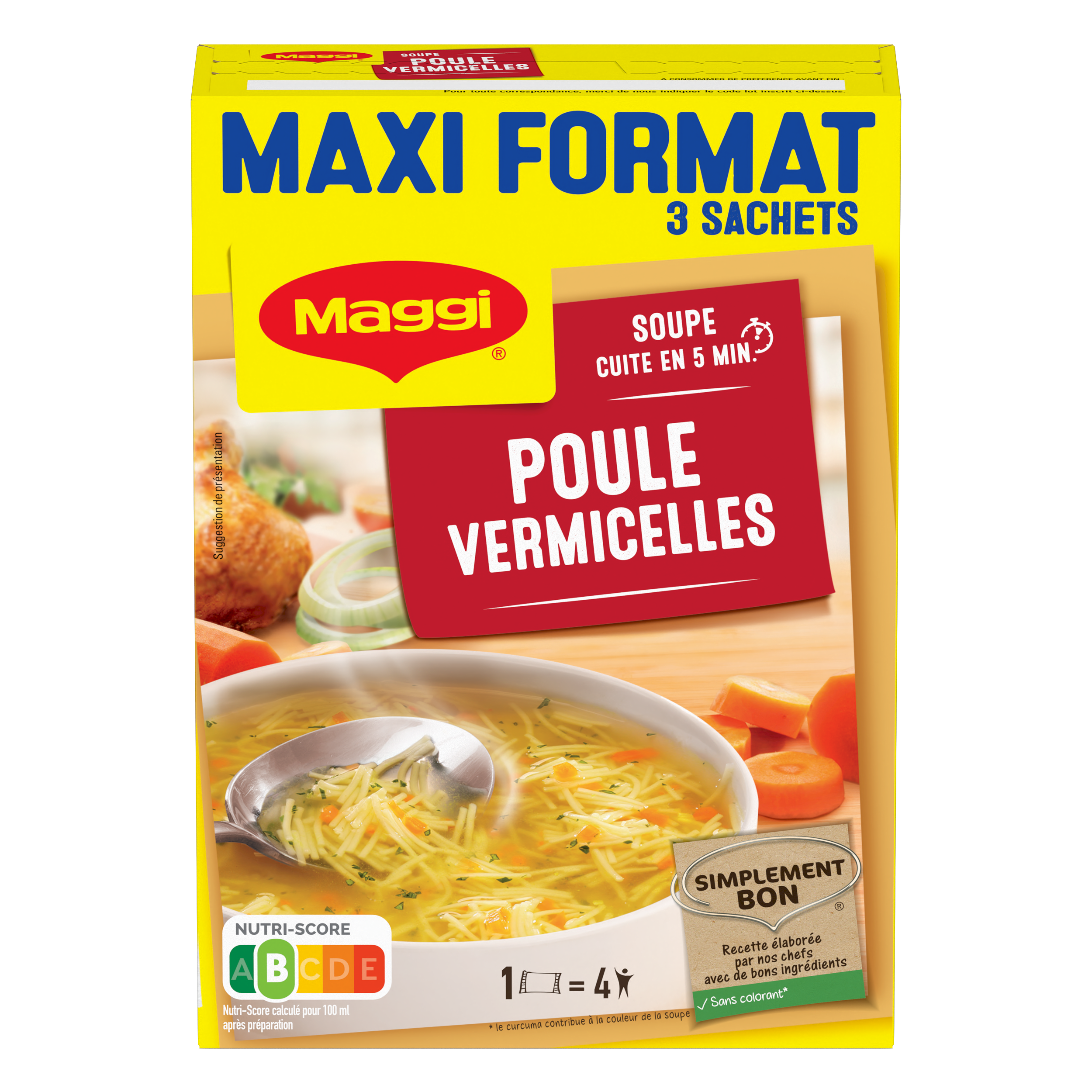 Découvrez ce format familial 3 sachets de 4 assiettes de cette délicieuse soupe MAGGI au bon goût de poule alliés à de généreux vermicelles. Le savoir-faire MAGGI : un bon goût de bouillon de poule associé à de délicieux vermicelles, un bouquet garni et juste ce qu'il faut de sel pour une soupe riche en goût.
