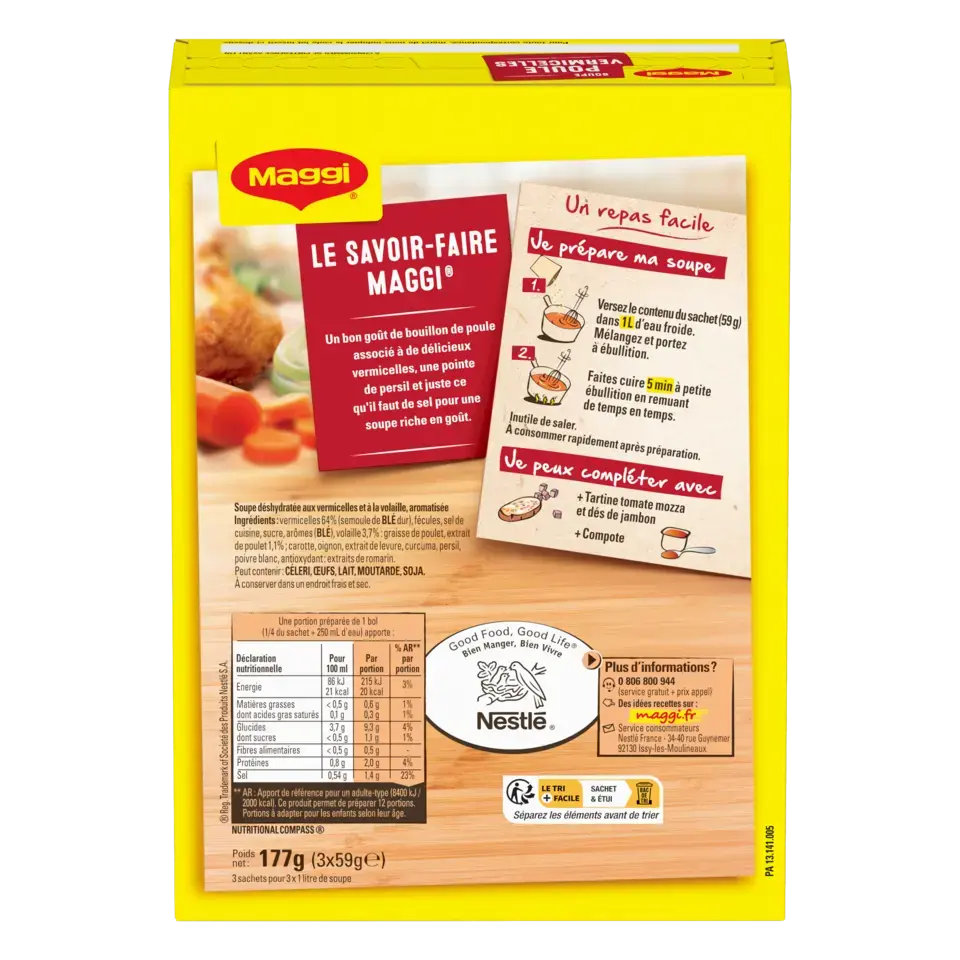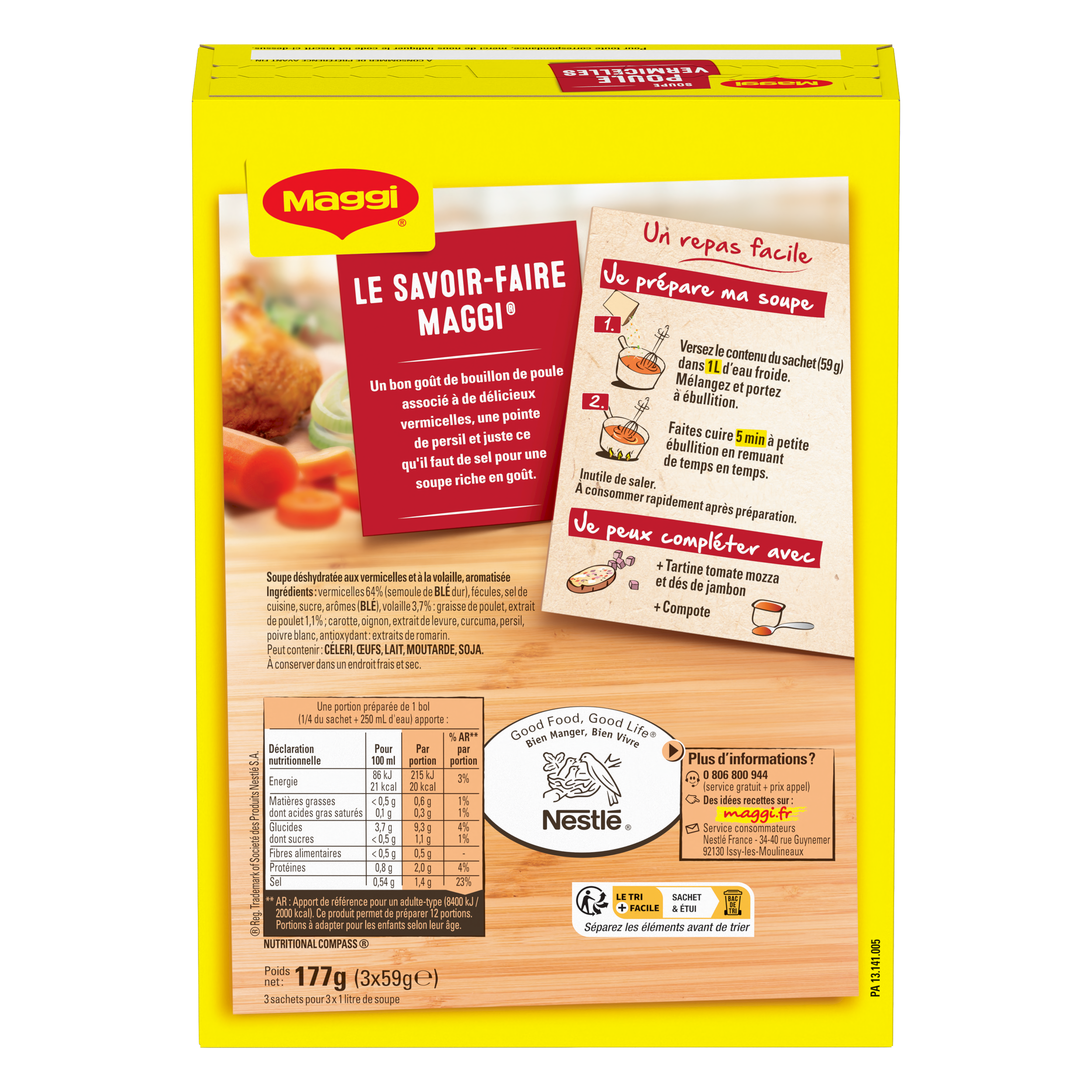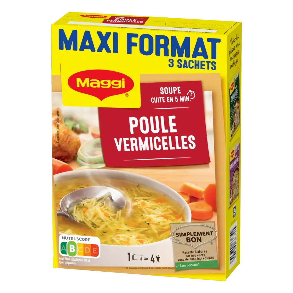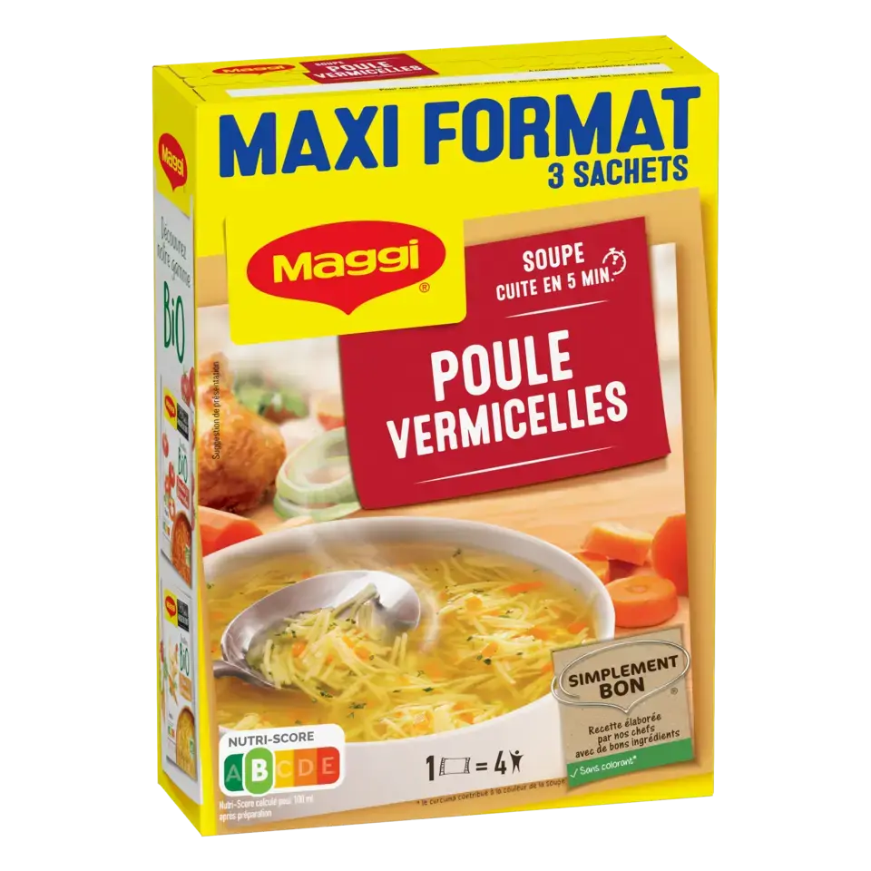 Découvrez ce format familial 3 sachets de 4 assiettes de cette délicieuse soupe MAGGI au bon goût de poule alliés à de généreux vermicelles. Le savoir-faire MAGGI : un bon goût de bouillon de poule associé à de délicieux vermicelles, un bouquet garni et juste ce qu'il faut de sel pour une soupe riche en goût.