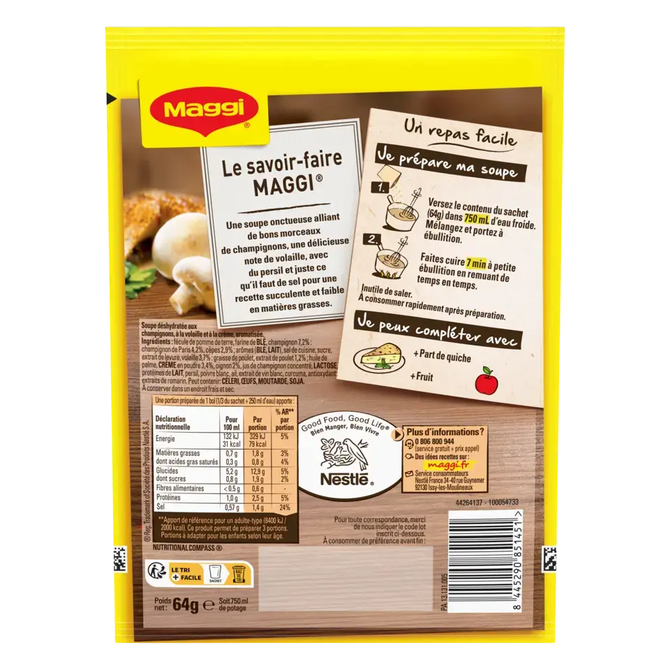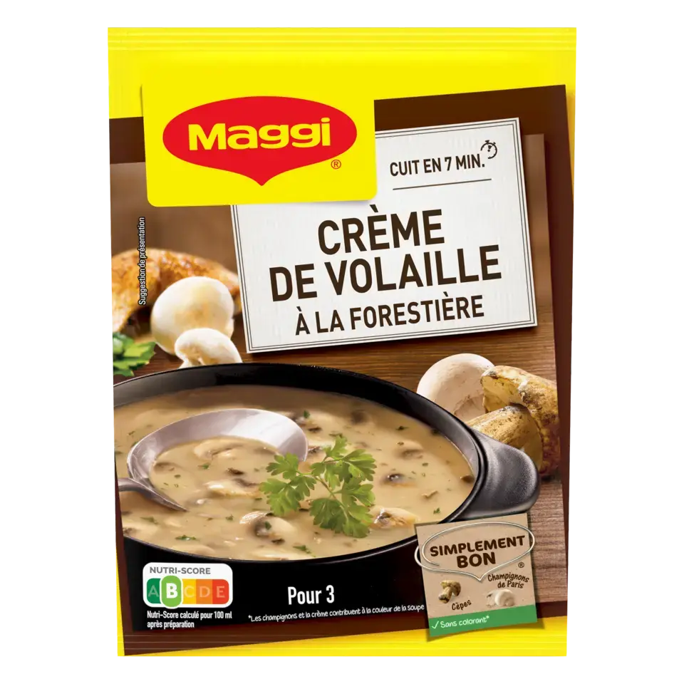 Le savoir-faire MAGGI: une soupe onctueuse alliant de bons morceaux de champignons, une délicieuse note de volaille avec un bouquet garni et juste ce qu'il faut de sel pour une recette succulente et faible en matières grasses. Avec MAGGI, retrouvez tout le plaisir d'une bonne soupe cuisinée, prête en 7 minutes.