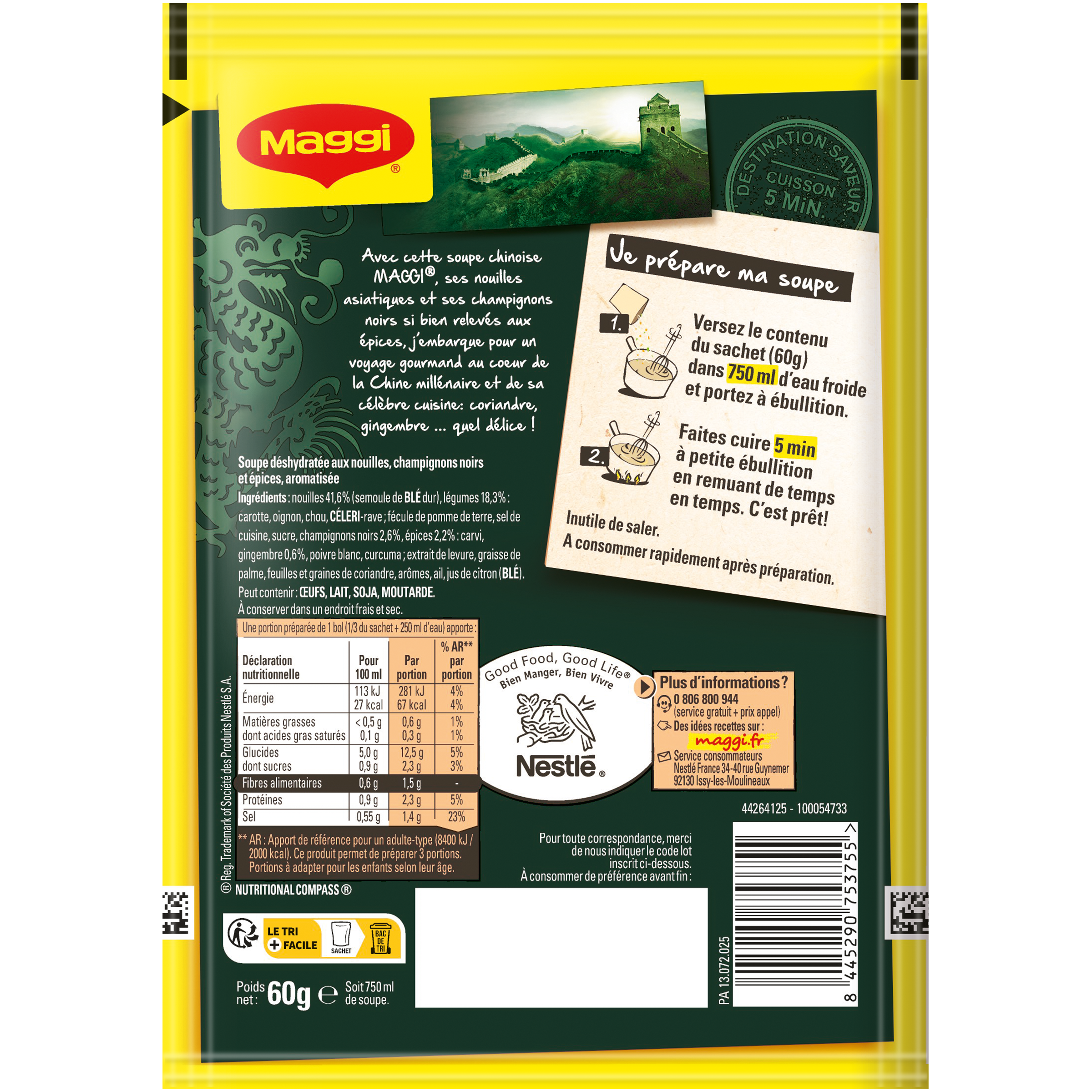 Avec cette soupe chinoise MAGGI, ses nouilles et ses champignons noirs si bien relevés aux épices, j'embarque pour un voyage gourmand au cœur de la Chine millénaire et de sa célèbre cuisine: coriandre, gingembre… quel délice ! Avec MAGGI, retrouvez tout le plaisir d'une bonne soupe exotique prête en seulement 5 minutes. Pour 3 personnes.