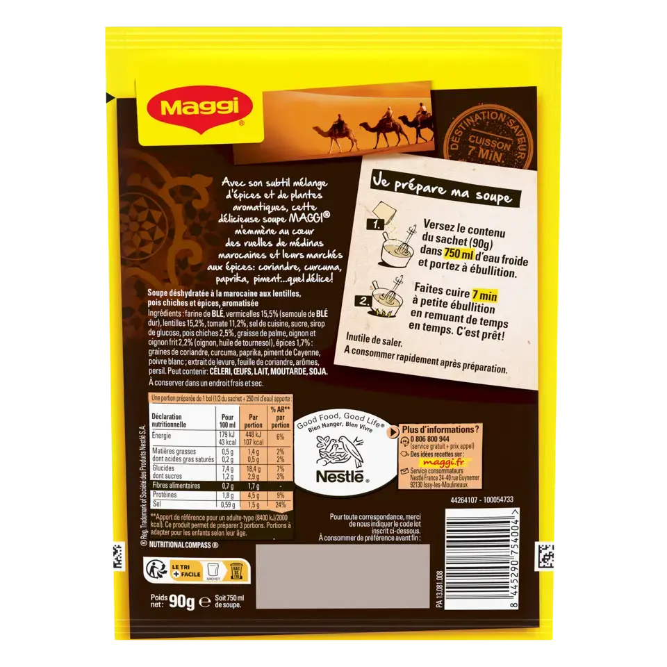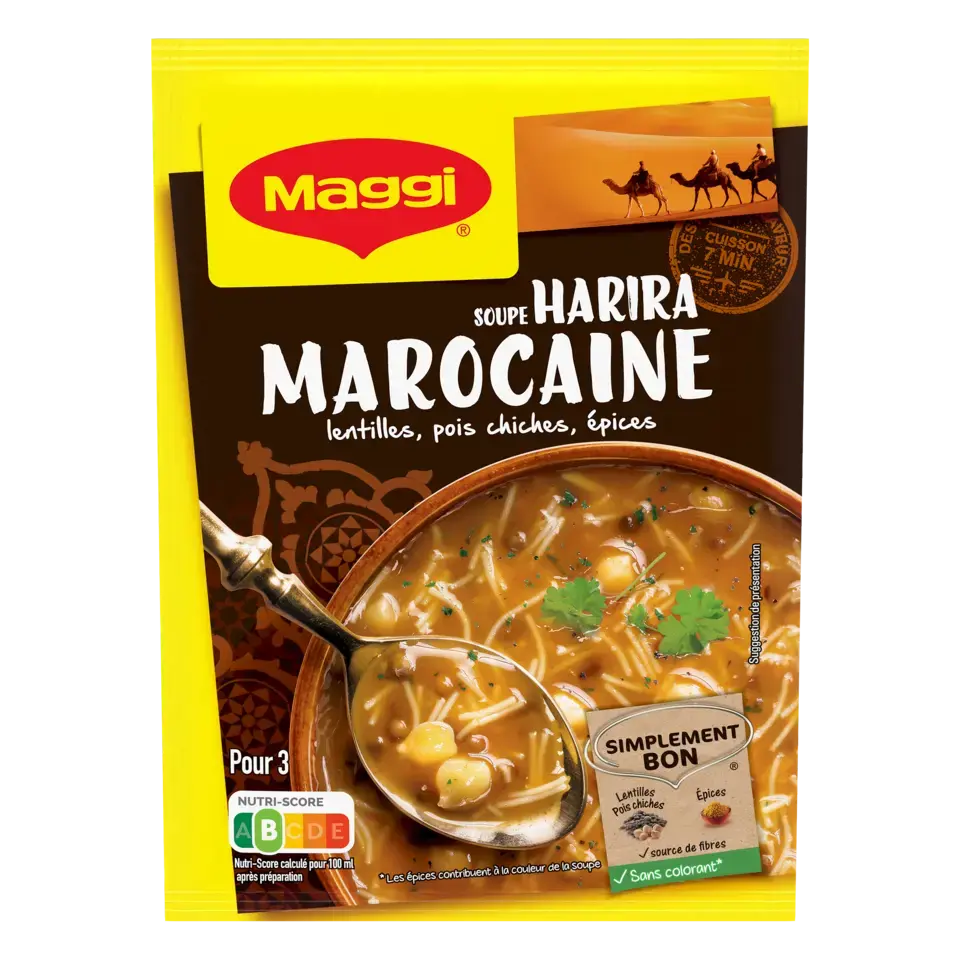 Avec son subtil mélange d'épices et de plantes aromatiques, cette délicieuse soupe Harira MAGGI m'emmène au cœur des ruelles des médinas marocaines et son marché aux épices: coriandre, curcuma, paprika, piment… quel délice! Avec MAGGI, retrouvez tout le plaisir d'une bonne soupe exotique prête en 7 minutes. Régalez vous !