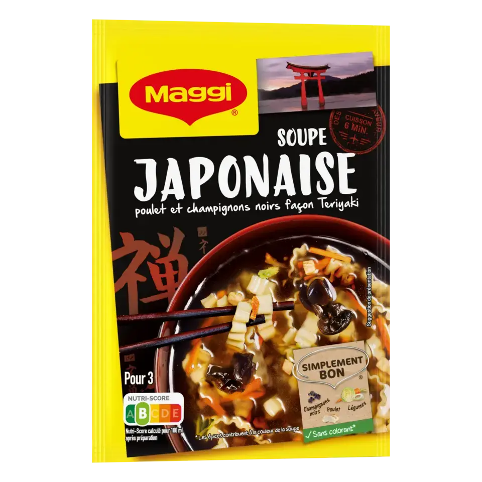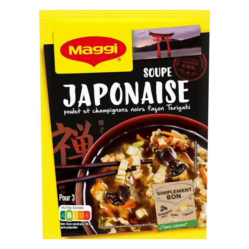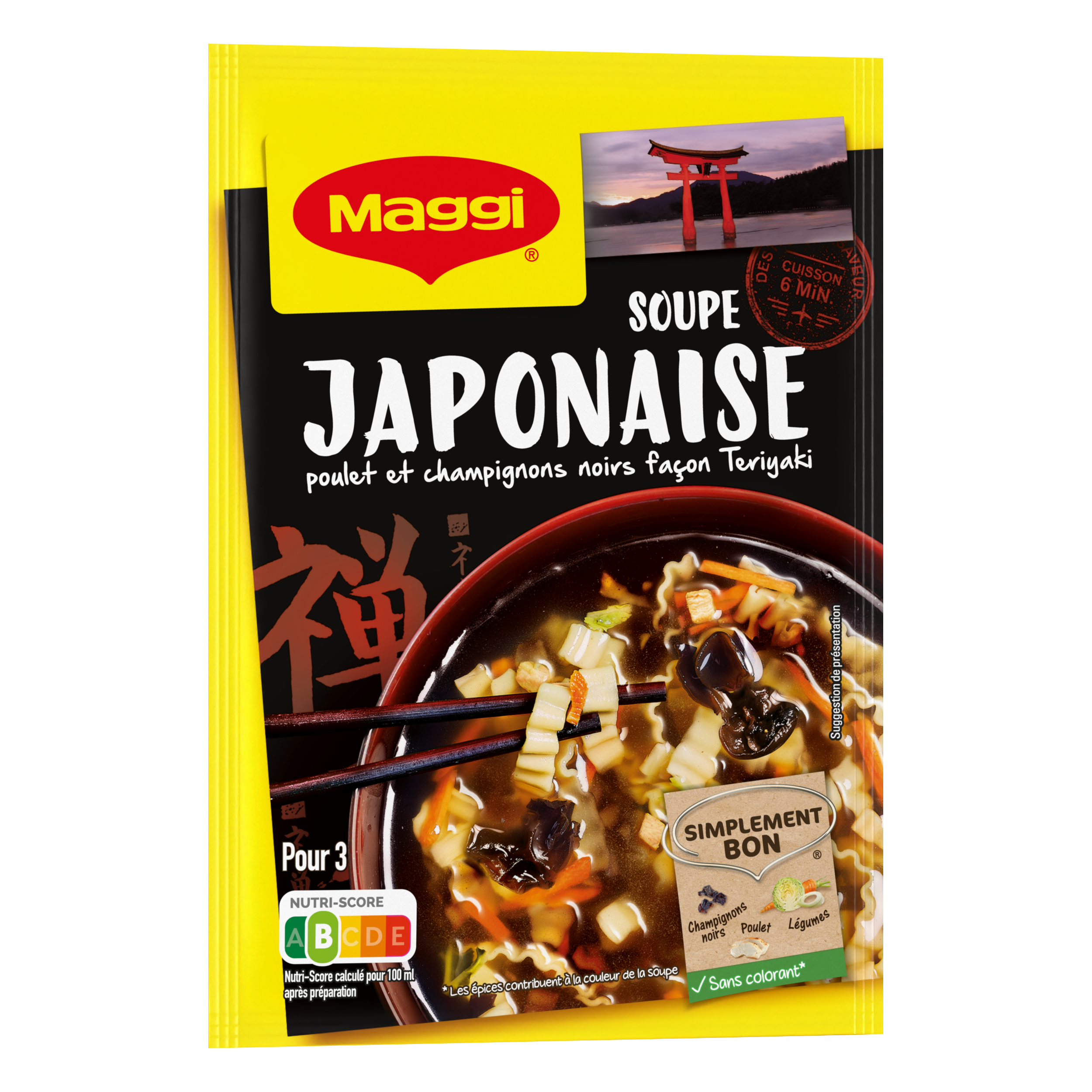 Le parfum de cette délicieuse recette de soupe de poulet MAGGI, légèrement sucrée avec sa note Teriyaki, ses nouilles et ses généreux champignons noirs, m'emporte pour un voyage gourmand au cœur du Japon… Avec MAGGI, retrouvez tout le plaisir d'une bonne soupe exotique prête en seulement 6 minutes et régalez-vous !