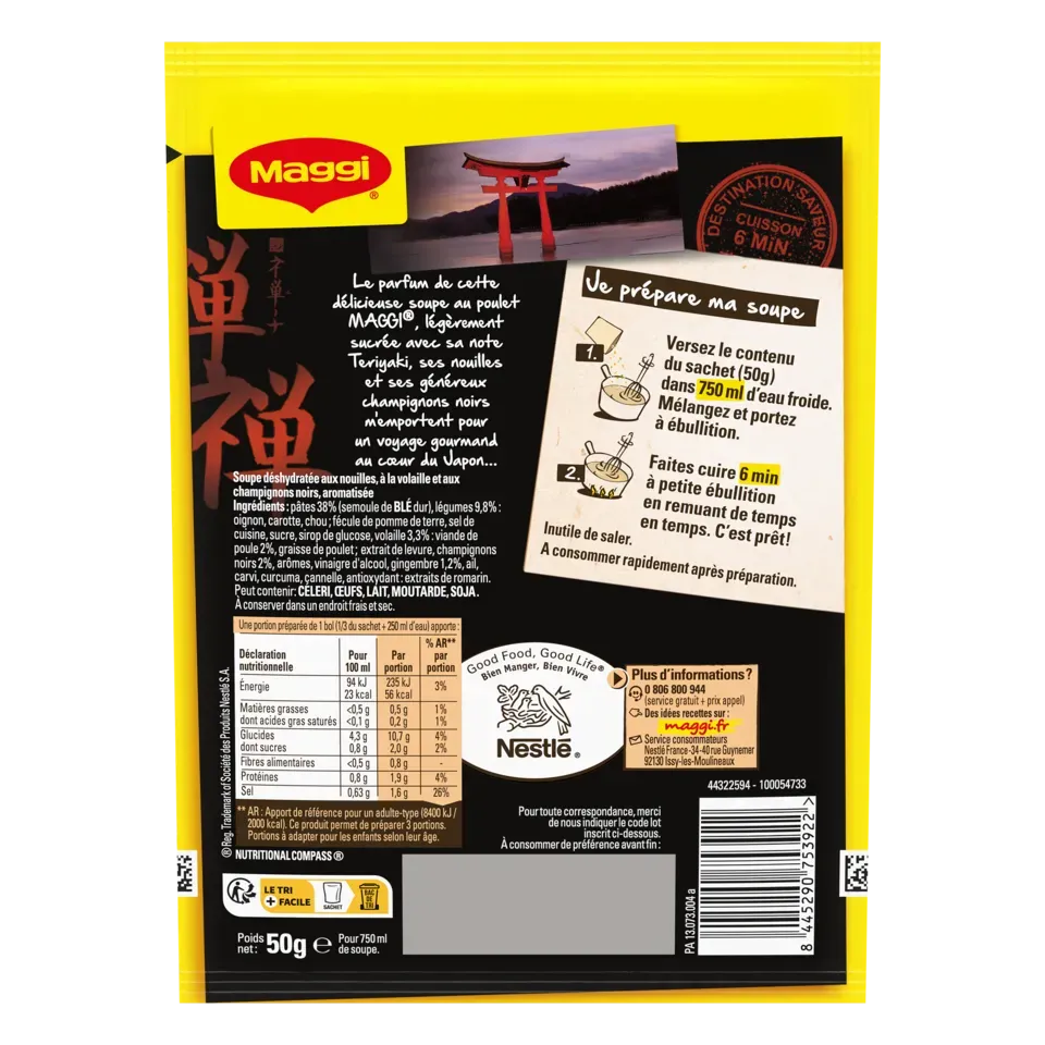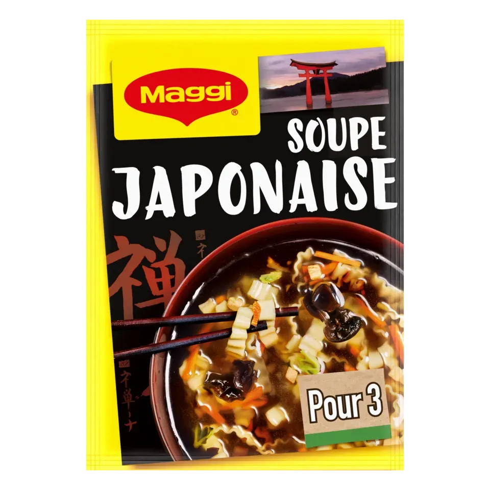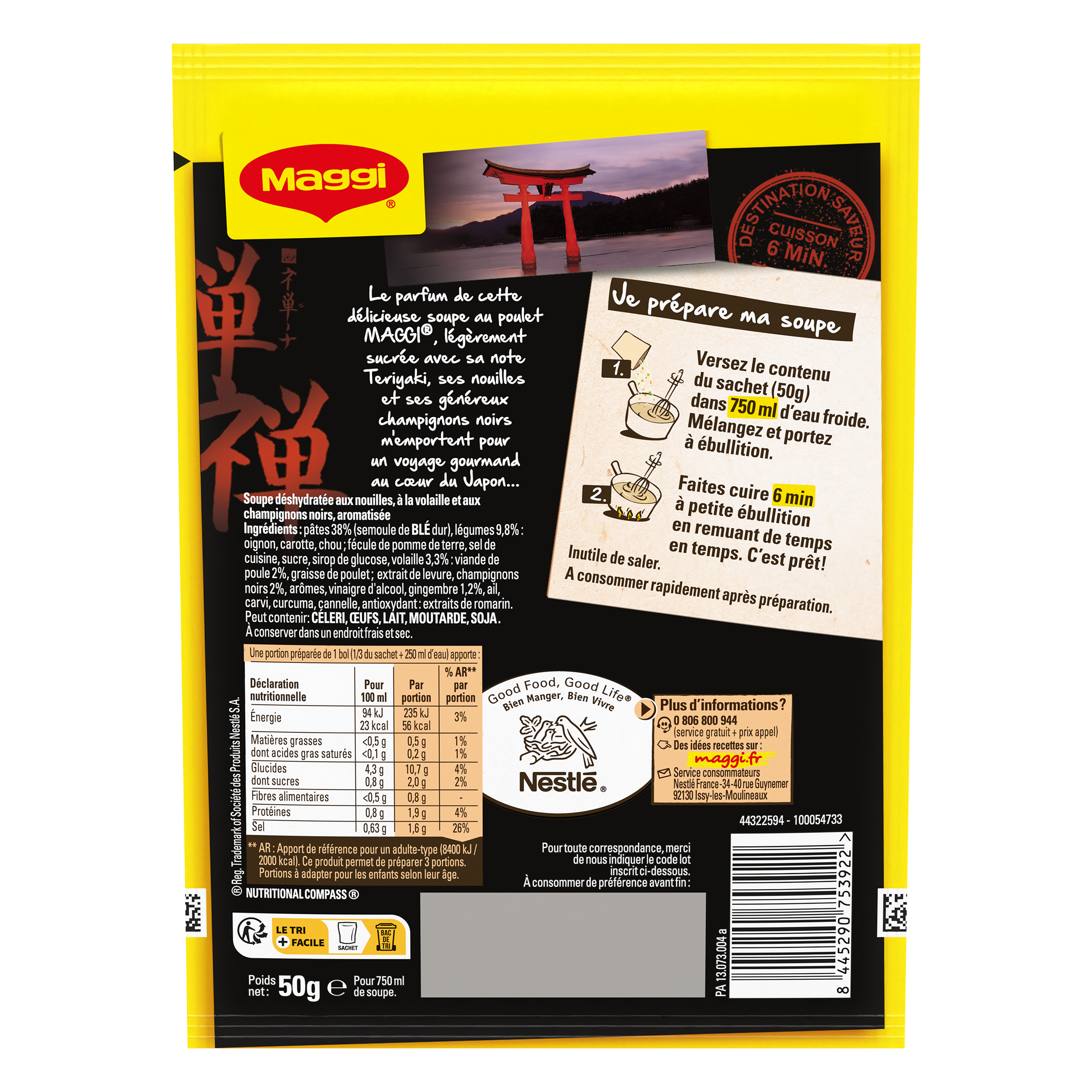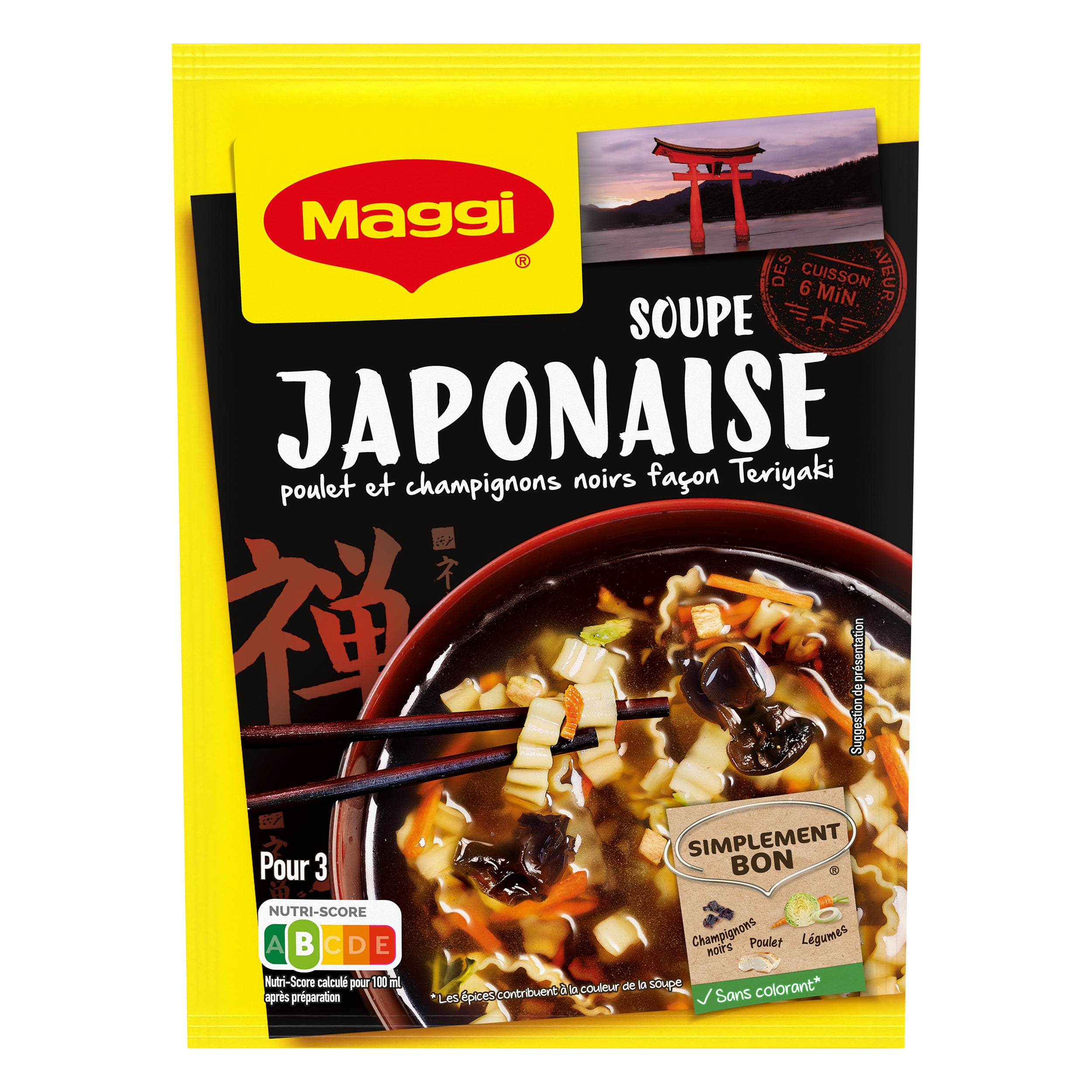 Le parfum de cette délicieuse recette de soupe de poulet MAGGI, légèrement sucrée avec sa note Teriyaki, ses nouilles et ses généreux champignons noirs, m'emporte pour un voyage gourmand au cœur du Japon… Avec MAGGI, retrouvez tout le plaisir d'une bonne soupe exotique prête en seulement 6 minutes et régalez-vous !