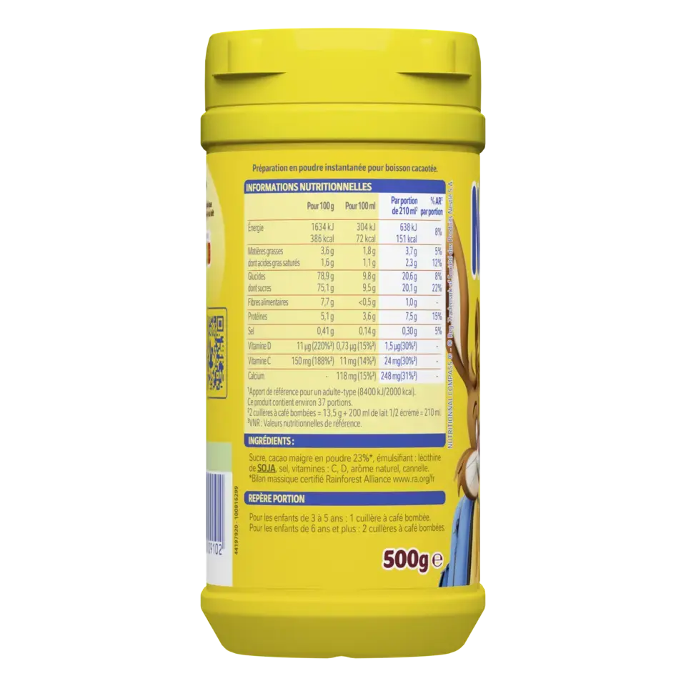 Ingrédients : Sucre, cacao maigre en poudre 23%*, émulsifiant : lécithine de SOJA, sel, vitamines : C, D, arôme naturel, cannelle. *Bilan massique certifié Rainforest Alliance www.ra.org/fr