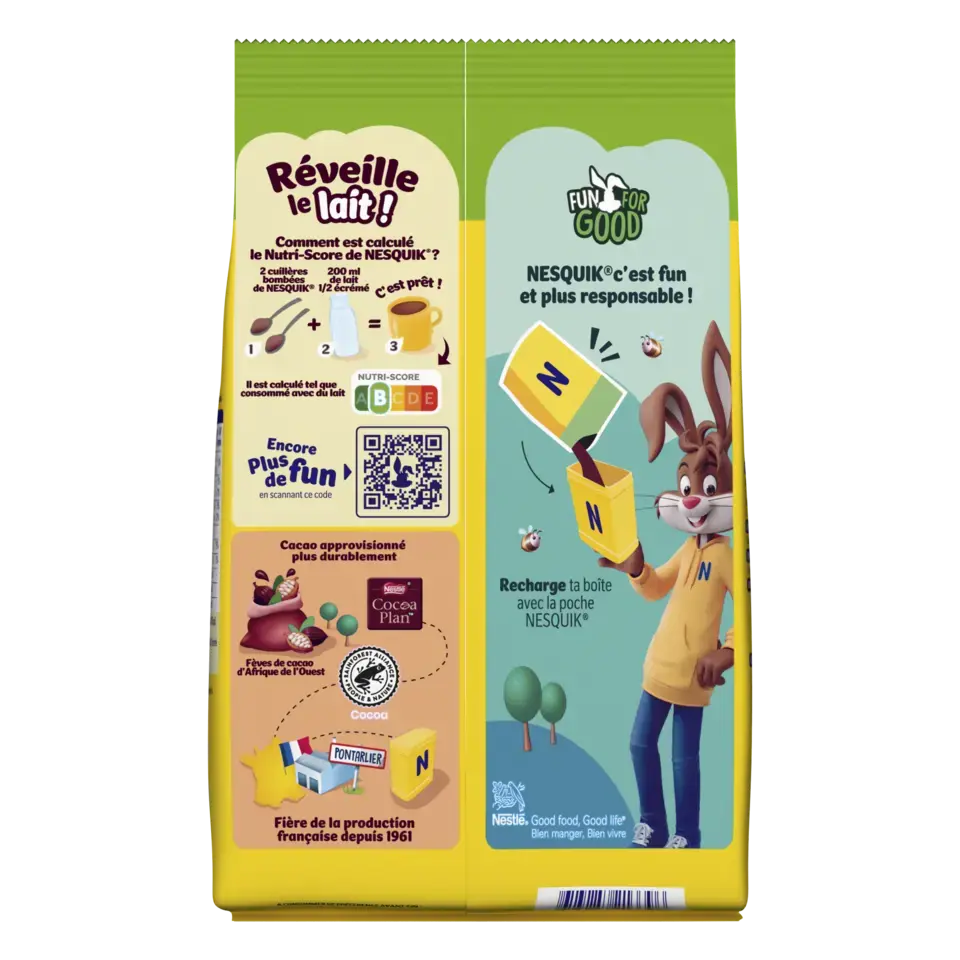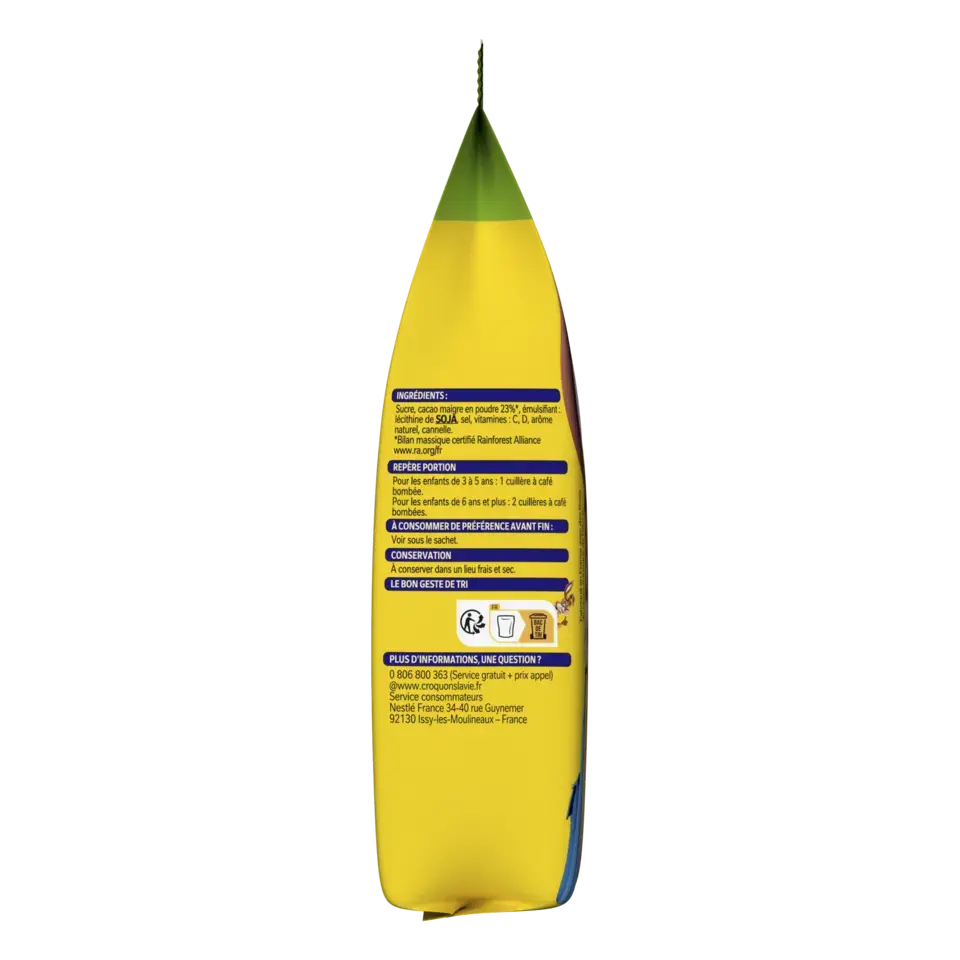 Ingrédients : sucre, cacao maigre en poudre 23%*, émulsifiant : lécithine de SOJA, sel, vitamines : C, D, arôme naturel, cannelle. *Bilan massique certifié Rainforest Alliance www.ra.org/fr.