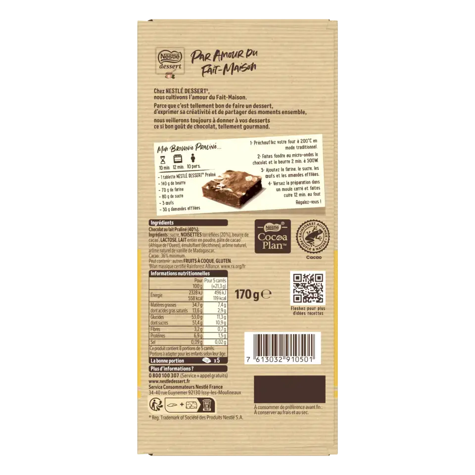 Sucre, NOISETTES torréfiées (20%), beurre de cacao¹, LACTOSE, LAIT entier en poudre, pâte de cacao (Afrique de l'Ouest), émulsifiant (lécithines), arôme naturel, arôme naturel de vanille de Madagascar. Cacao : 36% minimum. Peut contenir : autres FRUITS À COQUE, GLUTEN. ¹Bilan massique certifié Rainforest Alliance. www.ra.org/fr