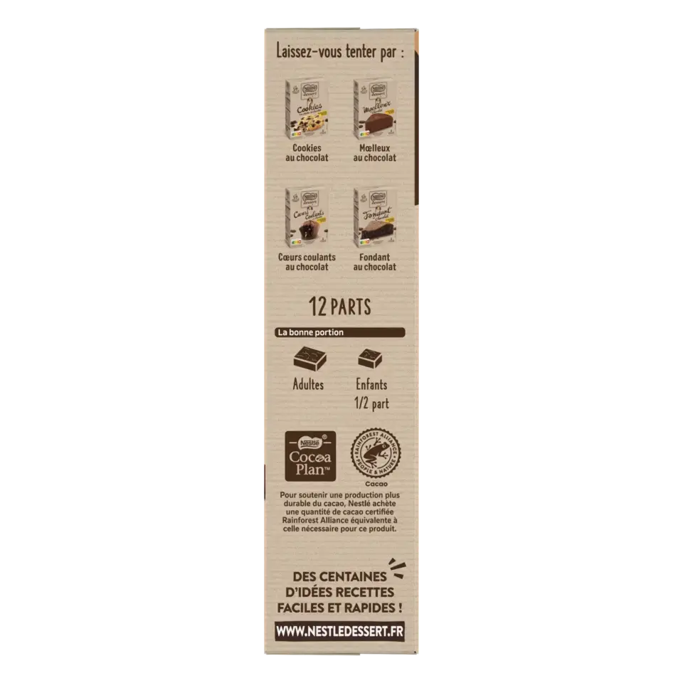 Les préparations pour gâteaux NESTLE DESSERT c'est l'alliance de vrais palets de chocolat NESTLE DESSERT à faire fondre et d'un sachet de préparation aux ingrédients pré-dosés pour des gâteaux gourmands, rapides et faciles à réaliser. NESTLE DESSERT, un chocolat 100% pur beurre de cacao, à la fonte unique, préparé avec soin à partir de fèves sélectionnées.