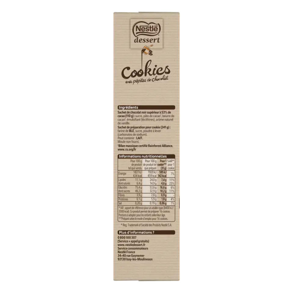 Sachet de chocolat noir supérieur à 53% de cacao (110 g) : sucre, pâte de cacao¹, beurre de cacao¹, émulsifiant (lécithines), arôme naturel de vanille. Sachet de préparation pour cookie (241 g) : farine de BLÉ, sucre, poudre à lever (carbonates de sodium). Peut contenir : LAIT. ¹Bilan massique certifié Rainforest Alliance. www.ra.org/fr. Pour soutenir une production plus durable du cacao, Nestlé achète une quantité de cacao certifiée Rainforest Alliance équivalente à celle nécessaire pour ce produit.