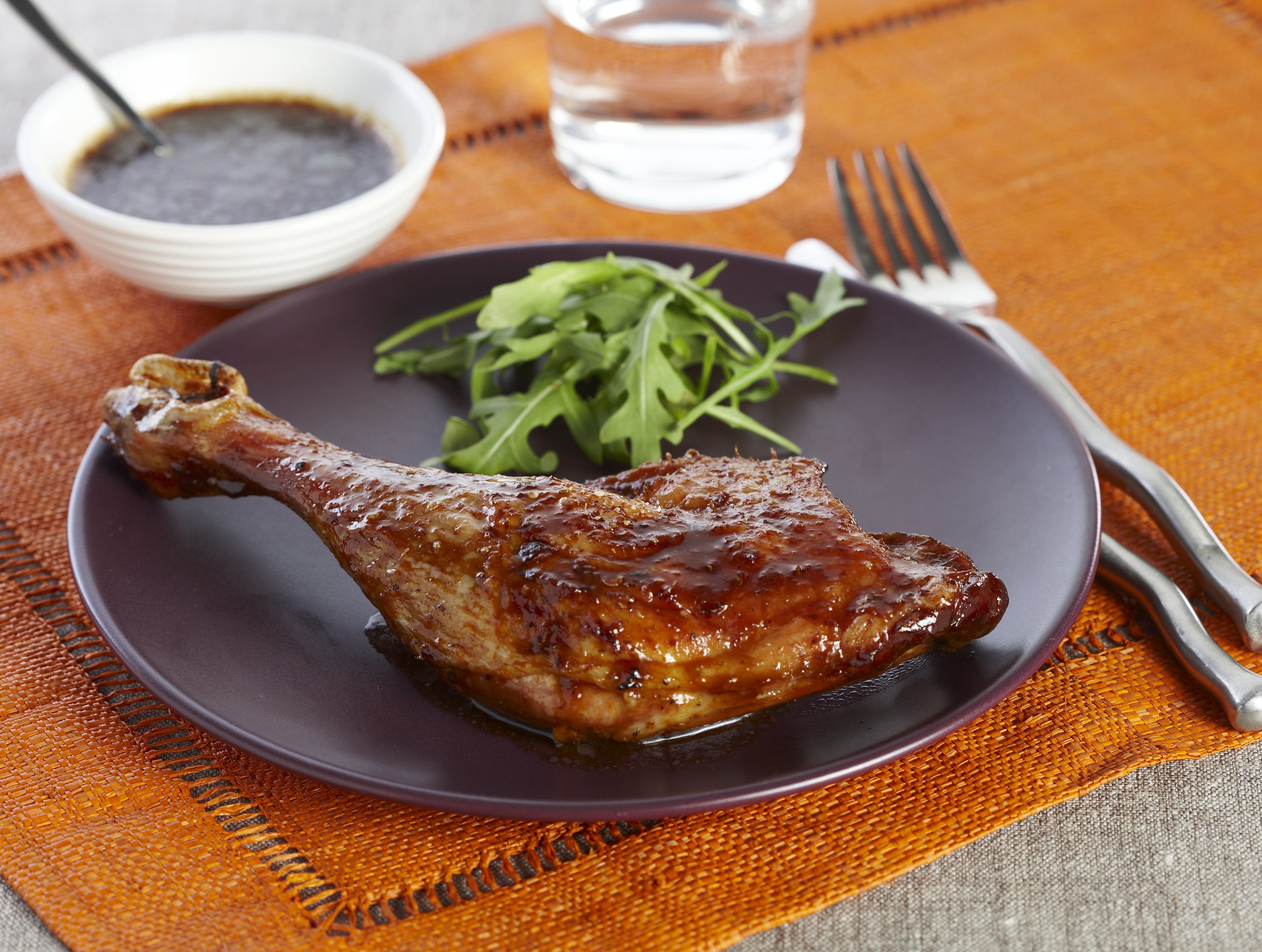 Les cuisses de canard à l'érable se marient particulièrement bien avec les légumes rustiques : crosnes cuites à l'eau avec une pointe de beurre, purée de potimarrons, courge, spaghetti...