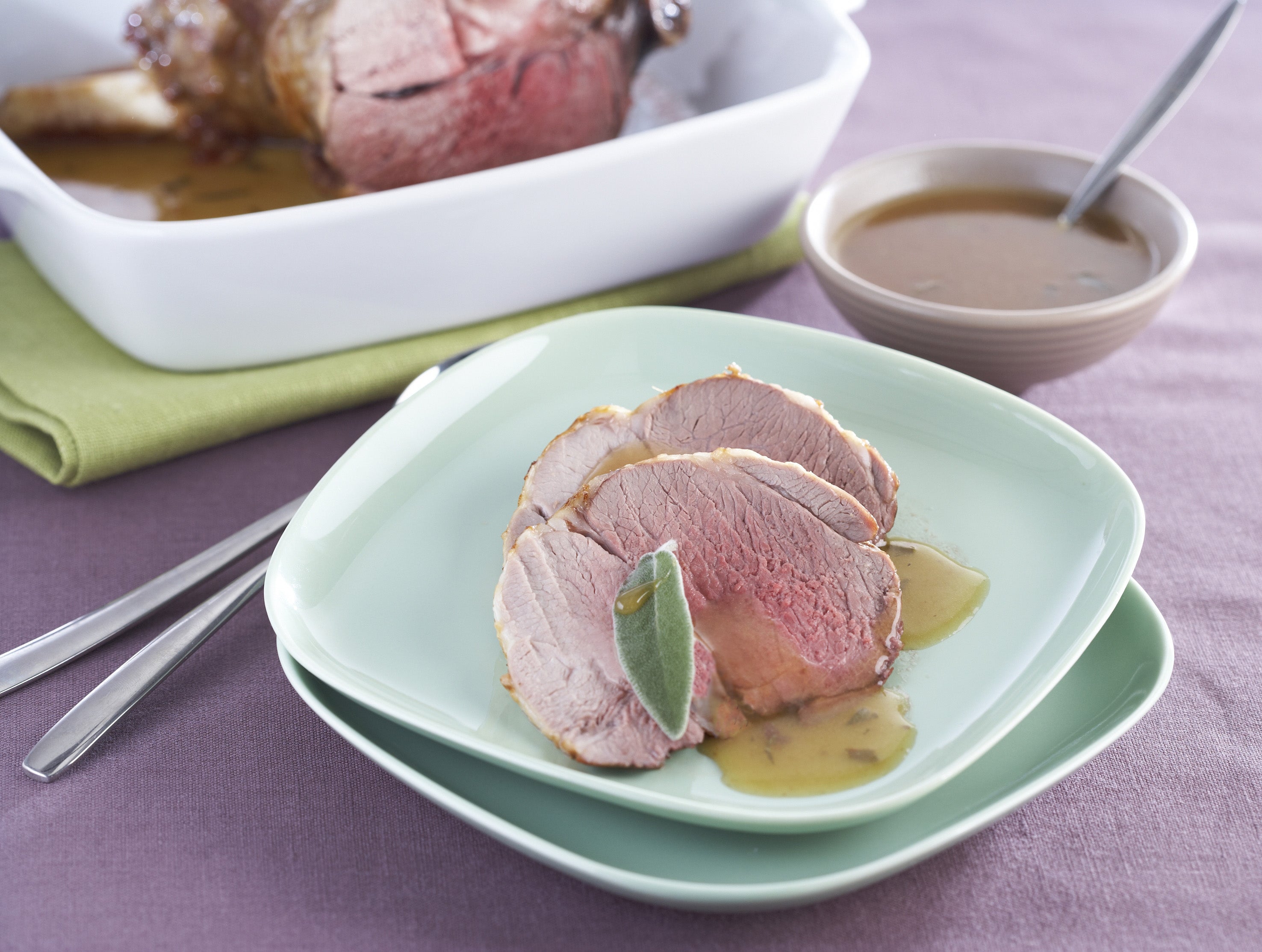 Accompagnez ce gigot d'haricots verts poêlés avec une Noix de Saveur Ail-Persil. Dans ce plat, le parfum de l'agneau se combine à merveille avec la sauge, un condiment apprécié pour l'odeur forte et épicée qu'il dégage