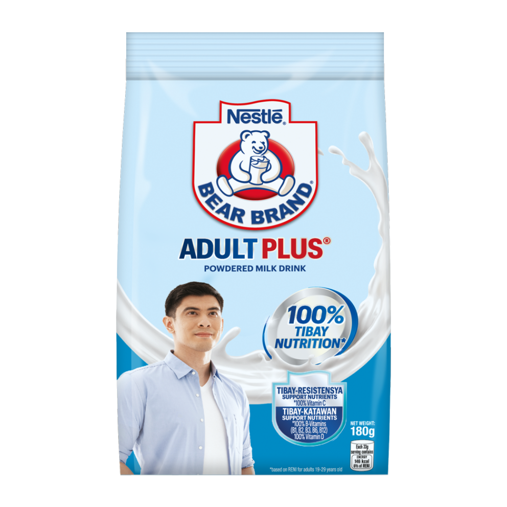 Ang BEAR BRAND Adult Plus ay sadyang ginawa tulong para sa tibay ng katawan at isipan ng mga adults! Ito ay may Tibay Katawan Nutrients (Vitamin C, D, Calcium, and Protein) for strong bones, muscles, and immunity. Ito rin ay may Tibay Isipan Nutrients (Vitamin B6, B9, and B12) for focus and concentration, at Taurine na dagdag tulong para sa brain function.