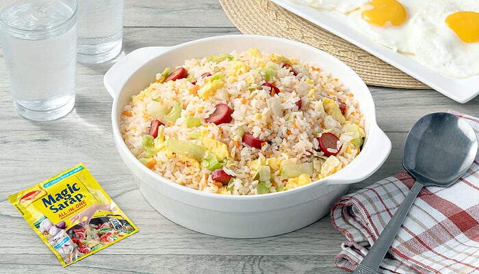 Serve Hotdog Fried Rice with fried egg for breakfast.