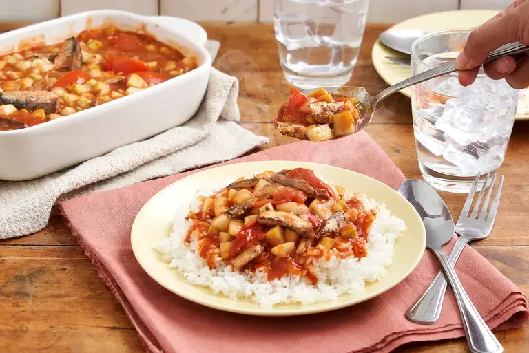Serve Ginisang Upo at Sardinas with rice for a complete meal.