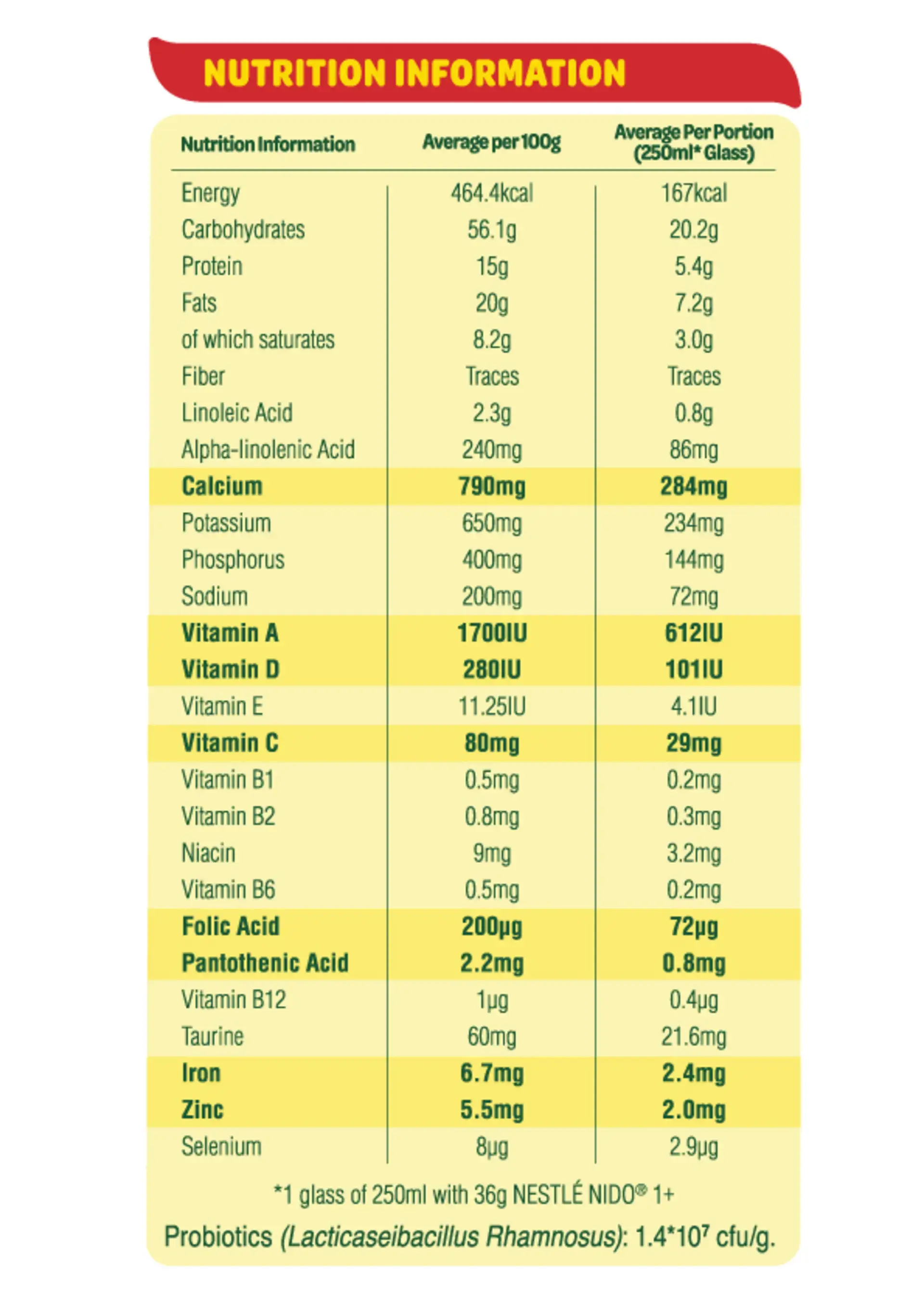 Milk Solids, Lactose, Vegetable Oils (Palm Olein, Low Erucic Rapeseed Oil, Coconut Oil, Sunflower Oil), Maltodextrin, Minerals (Calcium, Potassium, Phosphorus, Sodium, Iron, Zinc), Emulsifier (Soya Lecithin), Vitamins (A, C, D, E, B1, B2, B3, B5, B6, B12, Folic Acid), Taurine, Probiotics (Lacticaselbacillus Rhamnosus), Vanillin (Artificial Flavor).