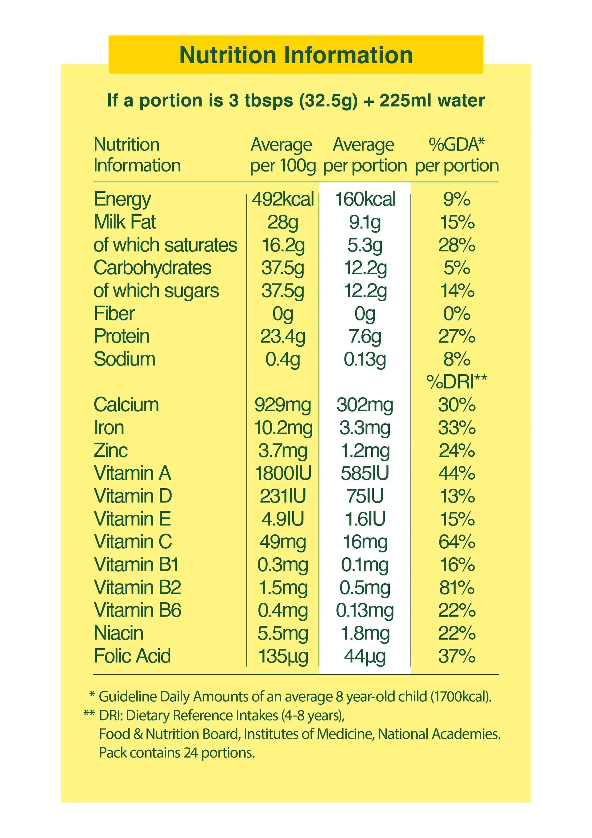 Milk Solids, Emulsifier (Soya Lecithin), Vitamins & Minerals