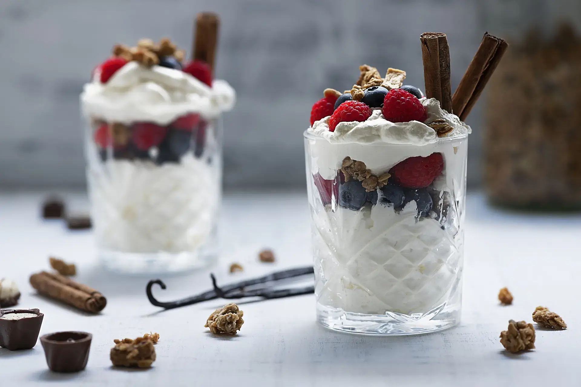 - Parfait là món tráng miệng phân tầng, kết hợp kem sữa, trái cây, ngũ cốc… tạo nên hương vị phong phú.