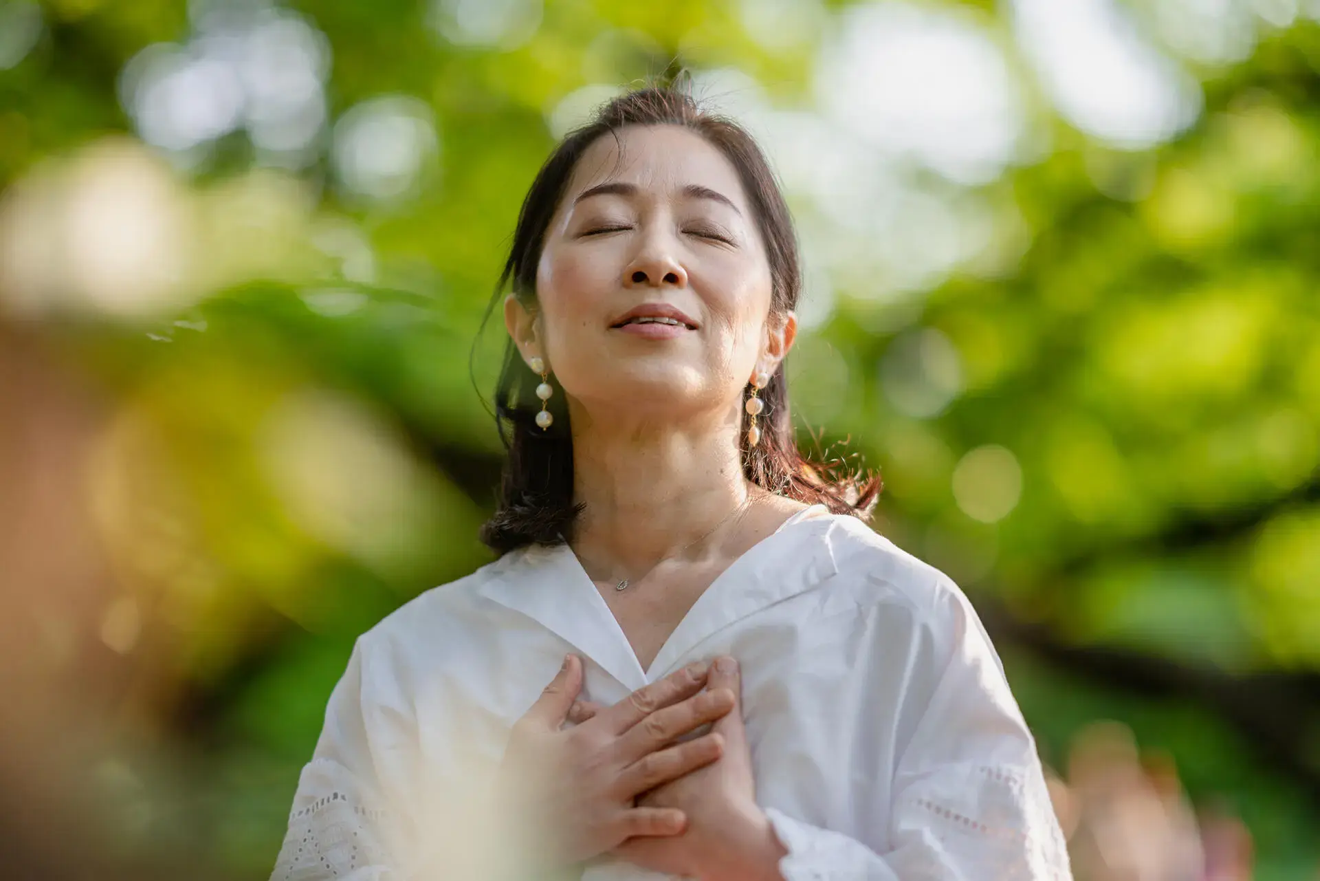 Vòng nhẹ nhàng hai cánh tay theo hình chữ C, tạo thành một vòng tròn ấm áp trước bụng. Lòng bàn tay hướng lên, như đang đón nhận năng lượng từ vũ trụ. Đặt một bàn tay lên trên bàn tay kia, tạo thành một điểm tựa vững chắc ngay tại vị trí Hara – trung tâm năng lượng của cơ thể. Nhẹ nhàng cảm nhận hơi thở vào ra, như một làn sóng tràn qua lòng bàn tay