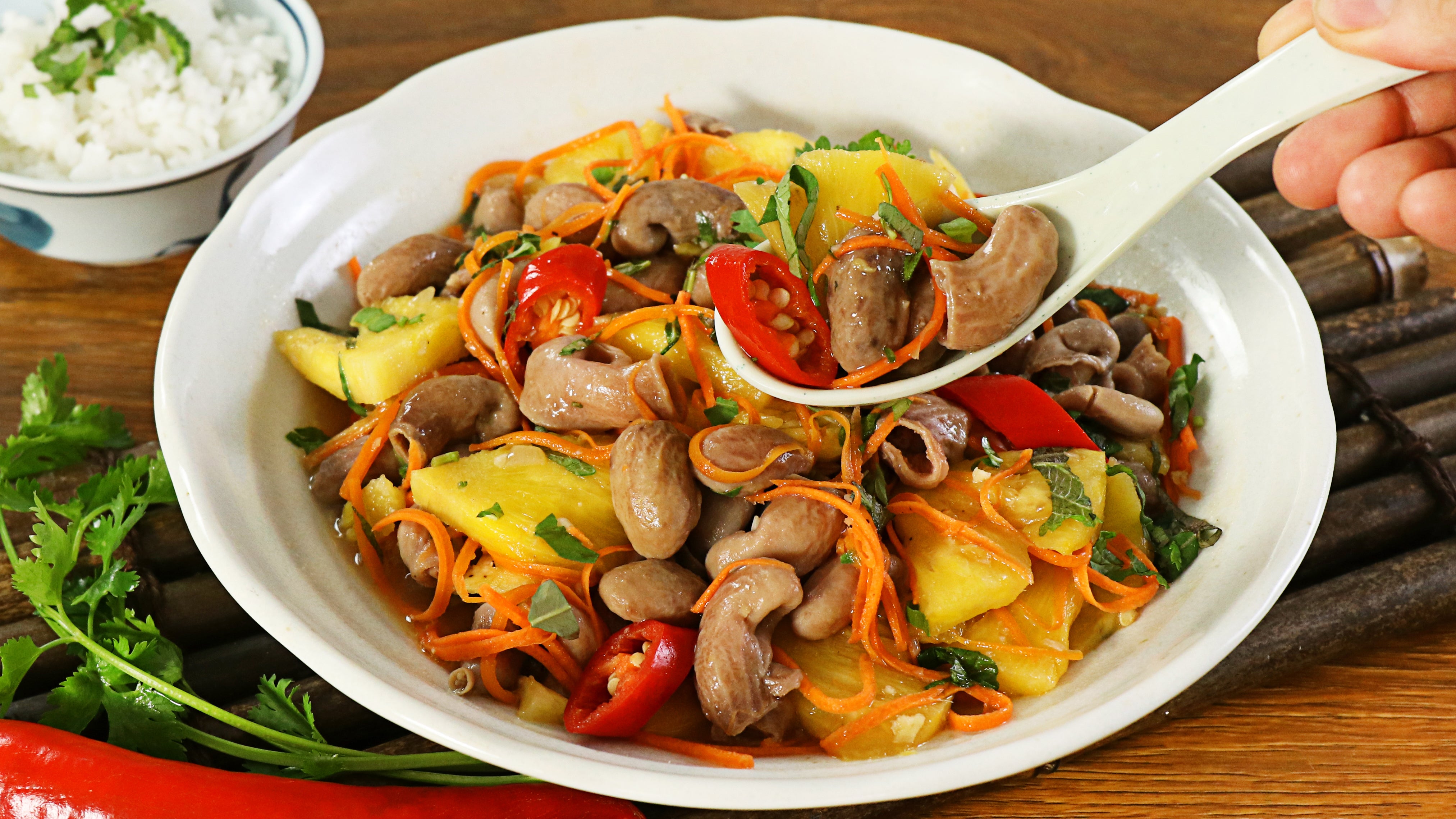 Thực khách không chỉ cảm nhận được vị giòn của bao tử cá mà còn thấy ngon miệng hơn với vị thơm cay của ớt, hành tây và chua ngọt của thơm.
